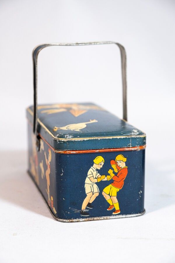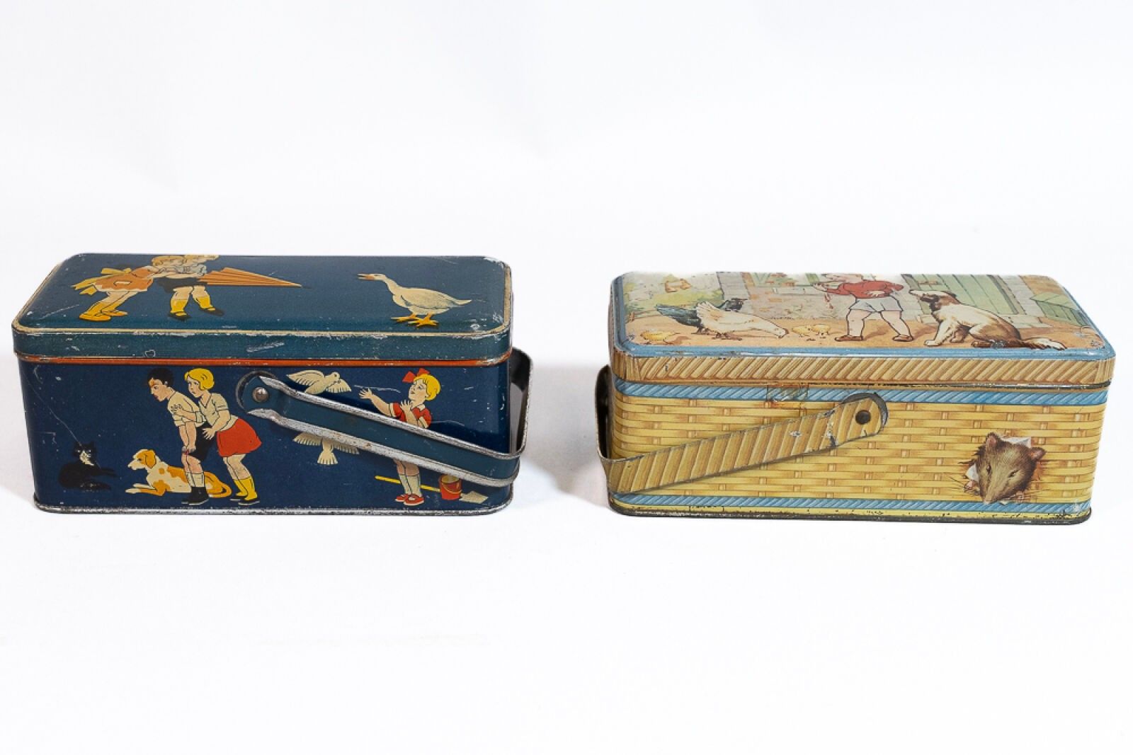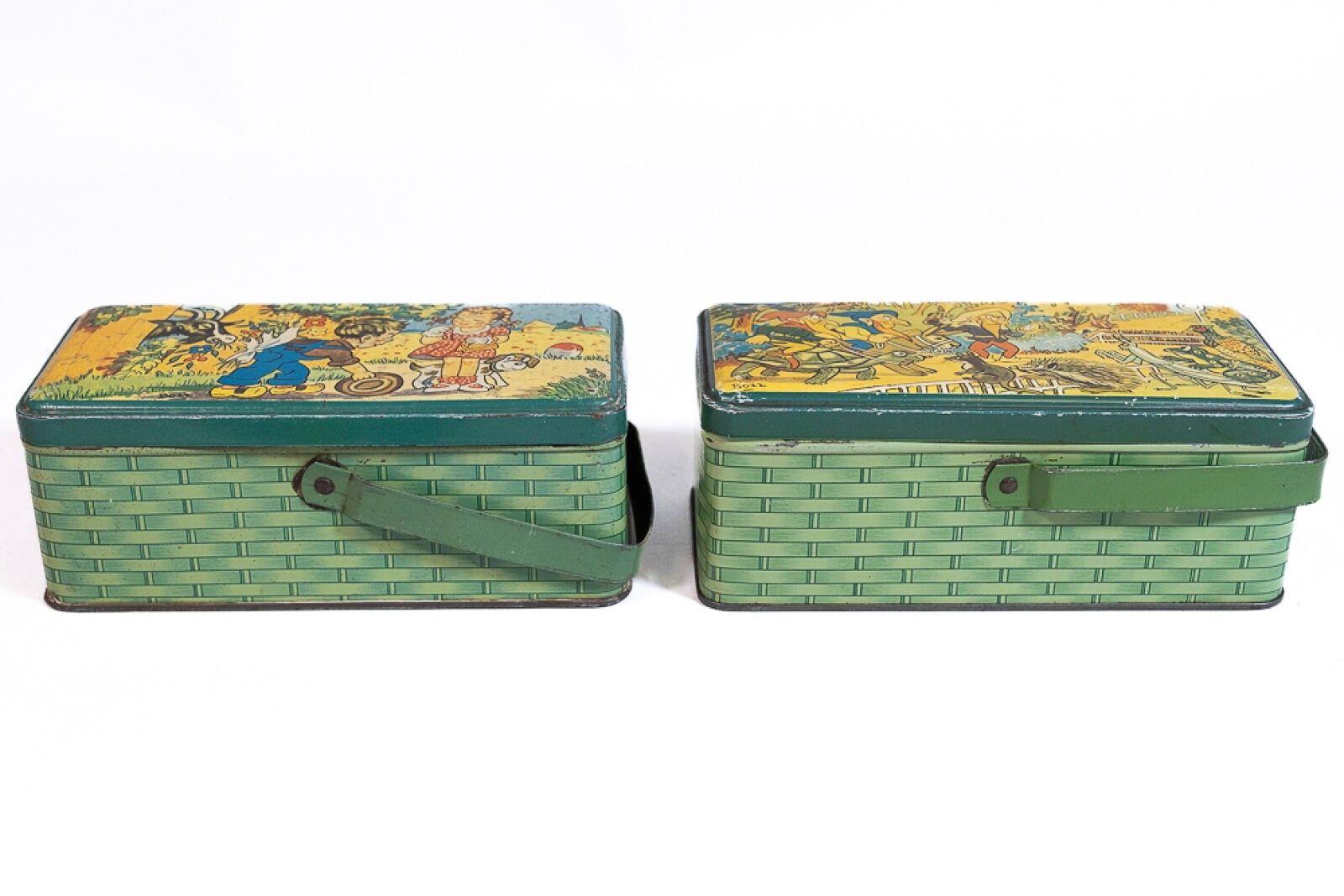 Set of 4 lithographed tin boxes in the form of TASTER BASKETS: theme of childhood, 2 signed BOZZ. good condition ( some alterations )