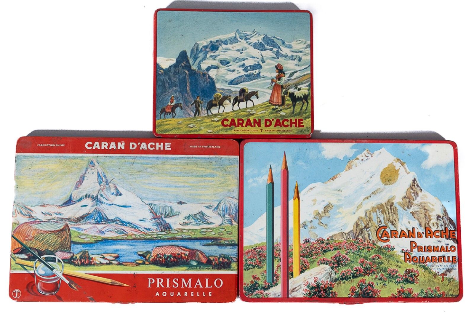CARAN D'ACHE PENCILS lot of 3 TIN BOXES representing Swiss mountains. Circa 1960-70.