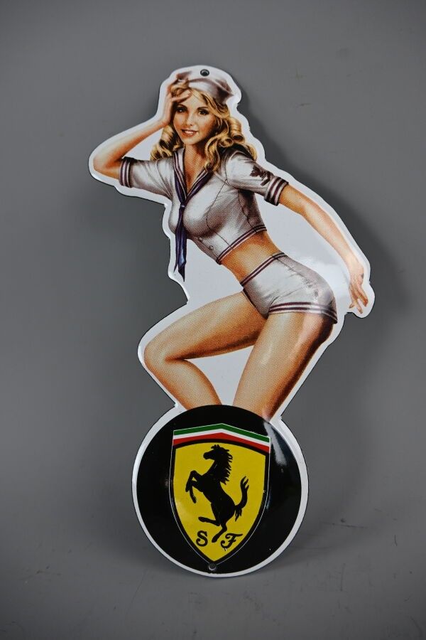 FERRARI, Enamelled sheet metal advertising plate, cut-out, showing a Pin-Up. Modern edition. Dimensions: 20 x 11 cm