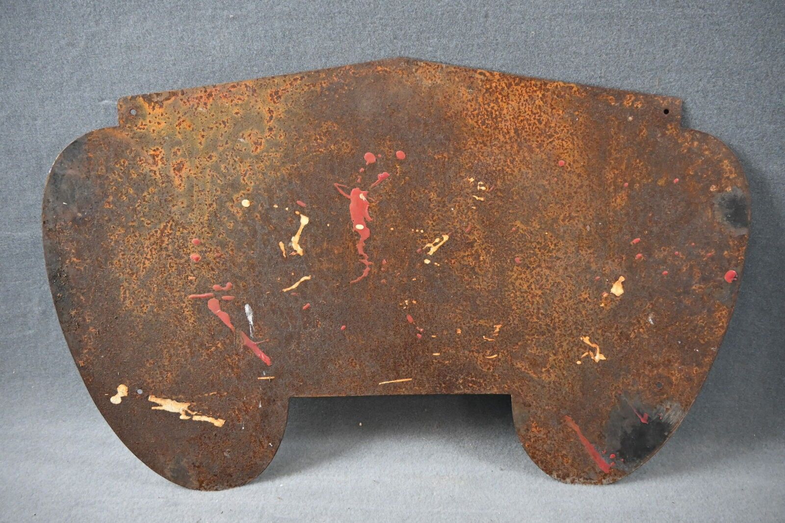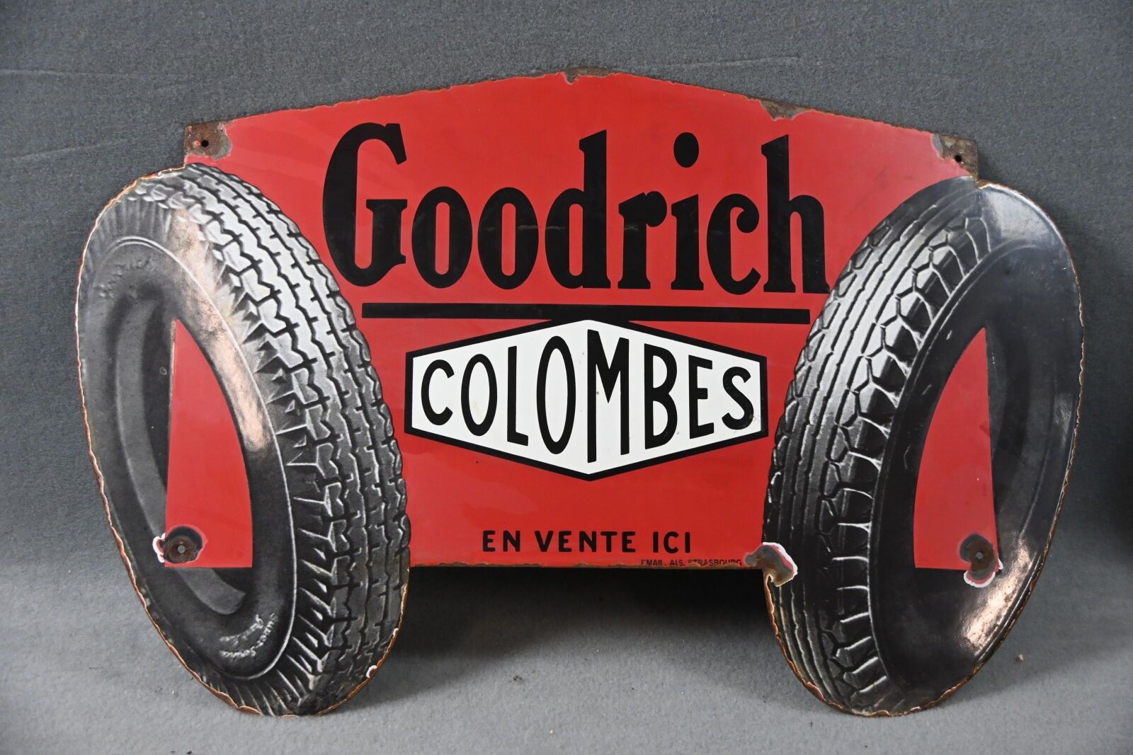 GOODRICH, Colombes. Advertising plate in enamelled sheet metal, cut-out, illustrated with 2 tyres. Email Als. Strasbourg. Chips, scratches, oxidation. Dimensions: 50 x 80 cm