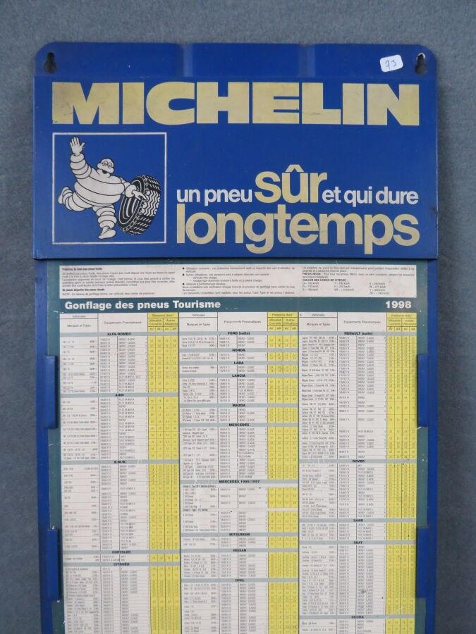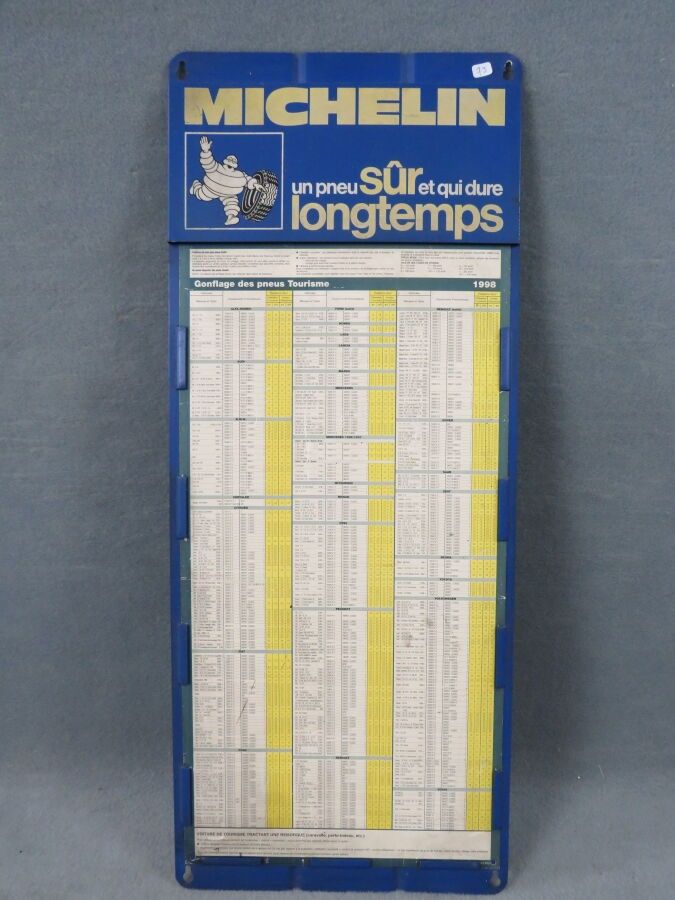 MICHELIN "Un pneu sûr qui dure longtemps" (A safe tyre that lasts a long time), 1998 lithographed sheet metal advertising plate for inflating touring tyres. Scratches, missing parts. Dimensions: 82 x 36 cm