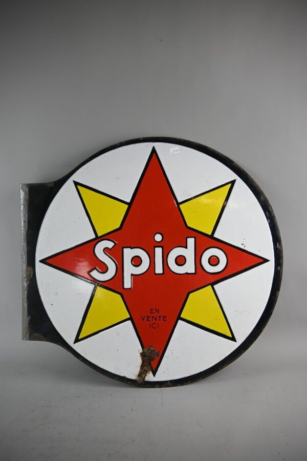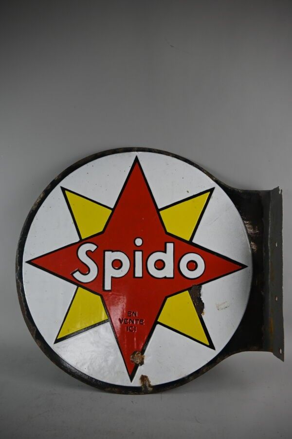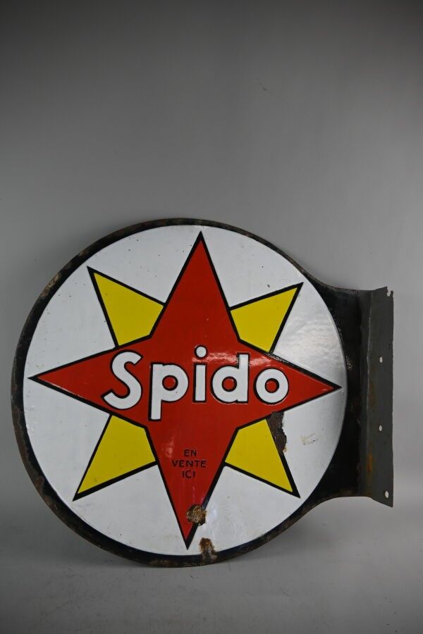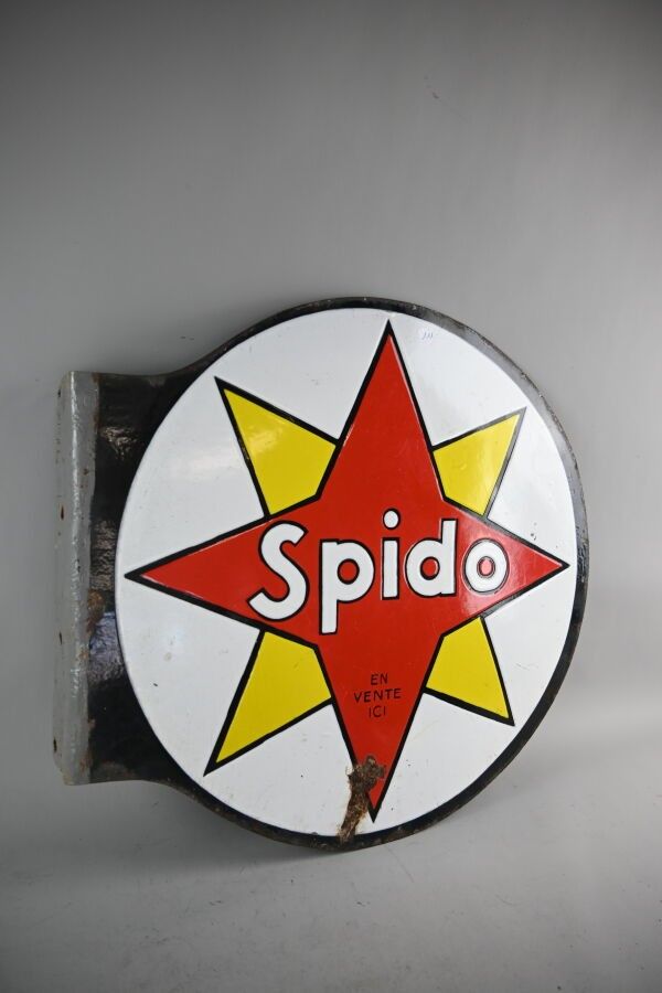 SPIDO, Double-sided circular enamelled sheet metal advertising plaque. Chips and scratches. Dimensions: 49 x 52 cm.