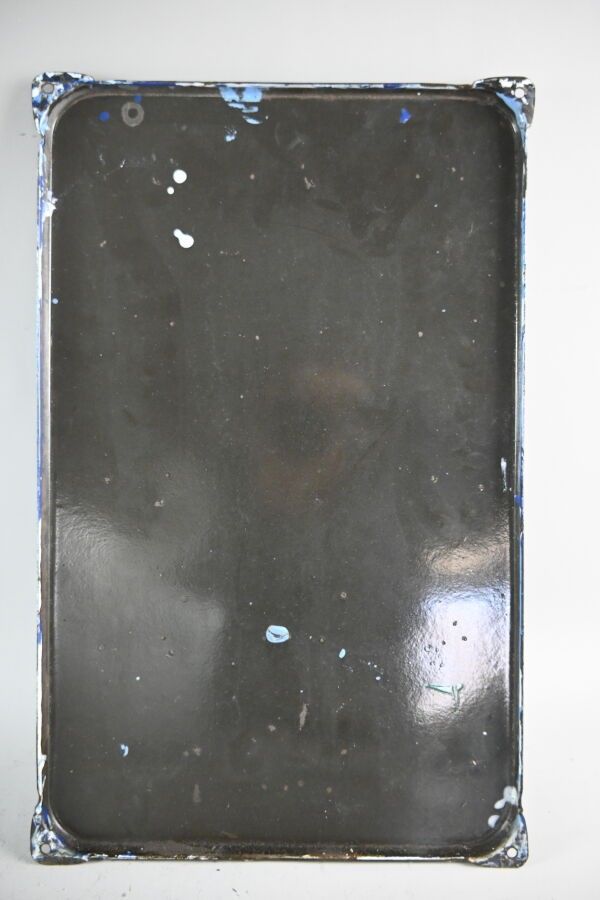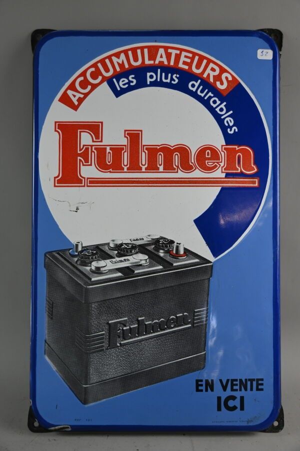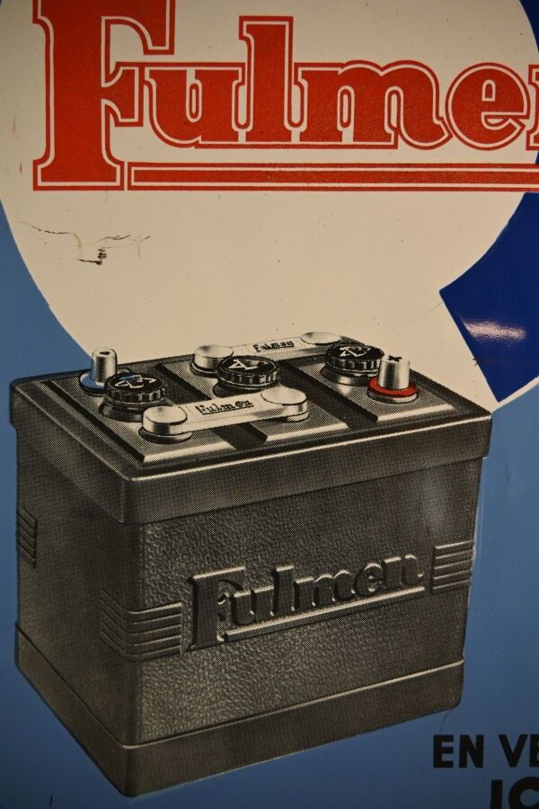 FULMEN, Accumulateurs les plus durables, Advertising plate in enamelled sheet metal, rectangular shape with lugs, illustrated with a battery. Émaillerie Alsacienne Strasbourg. Slight chips, scratches. Dimensions: 48 x 30 cm
