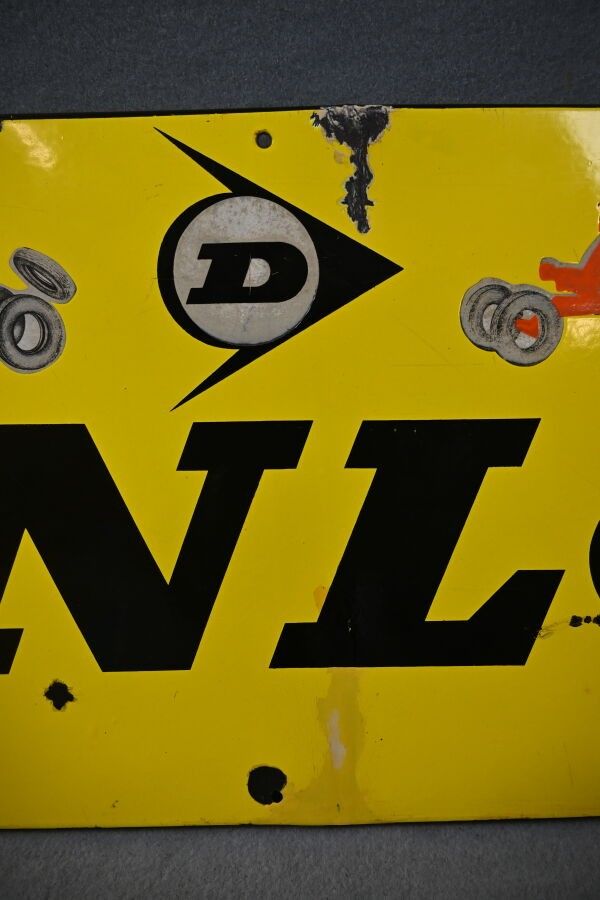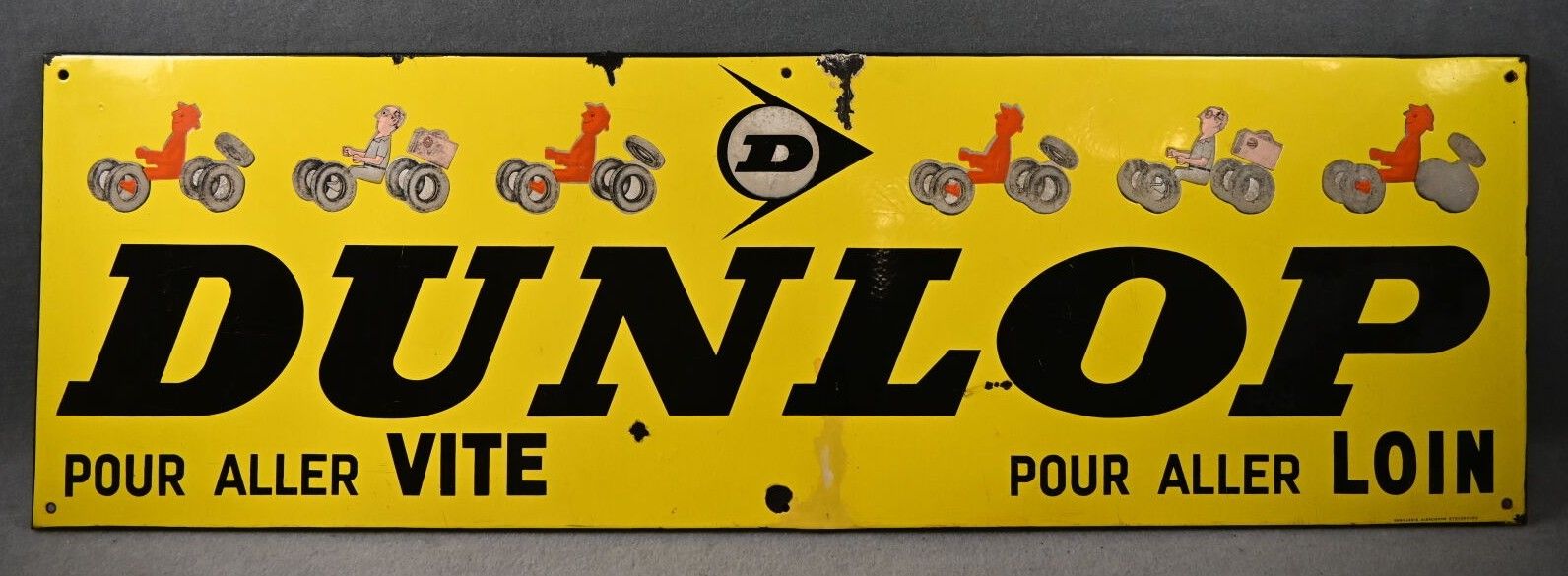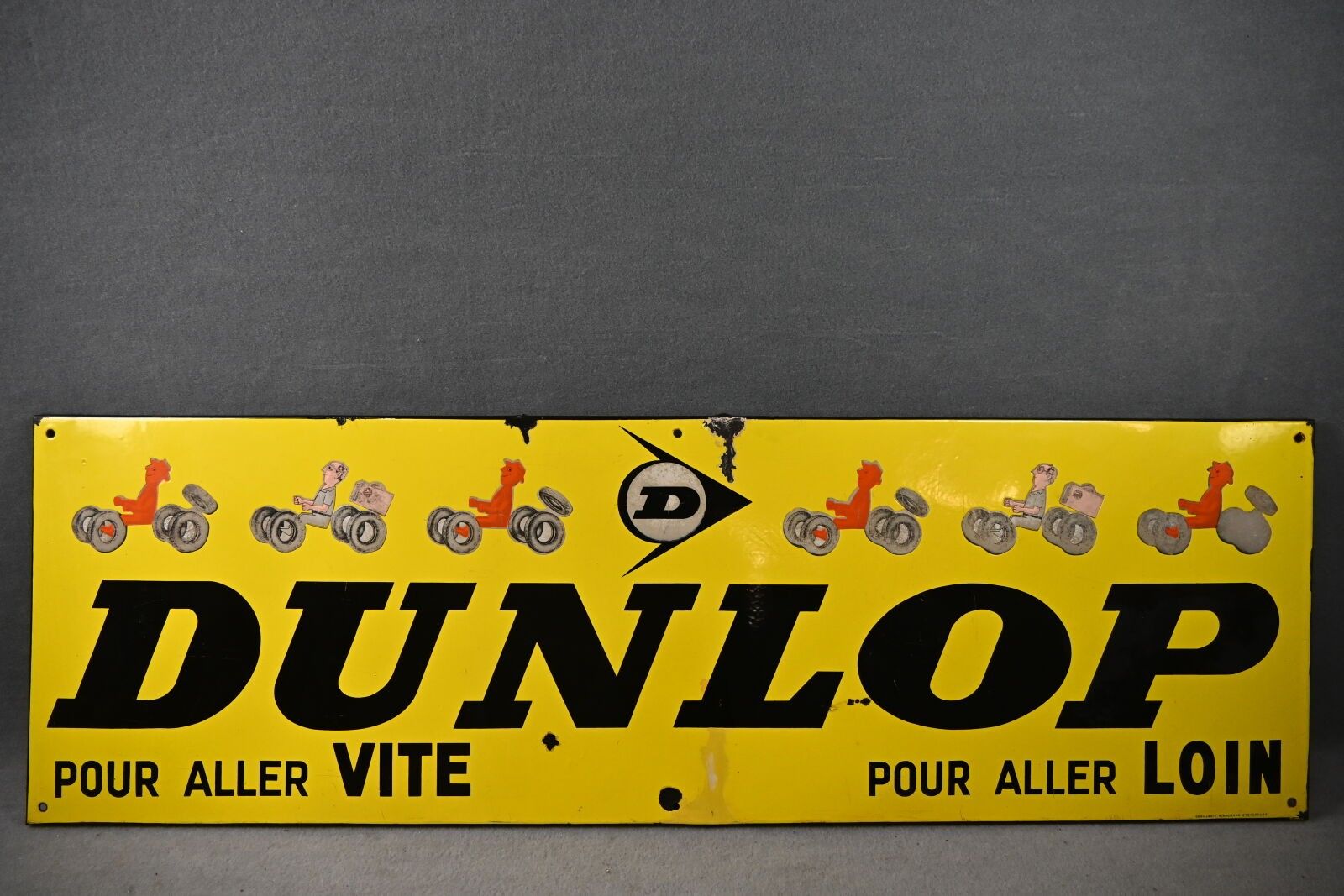 DUNLOP "Pour aller VITE...Pour aller LOIN". Advertising plate in enamelled sheet metal, chamfered rectangle shape, illustrated with the Petit Conducteur à la valise by SAVIGNAC. Émaillerie Alsacienne Strasbourg. Chips, scratches, deformation, restoration. Dimensions: 46 x 146 cm