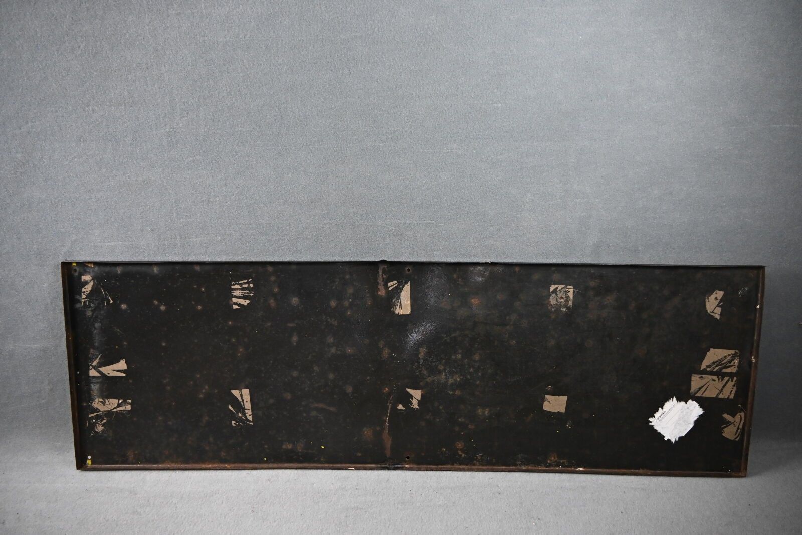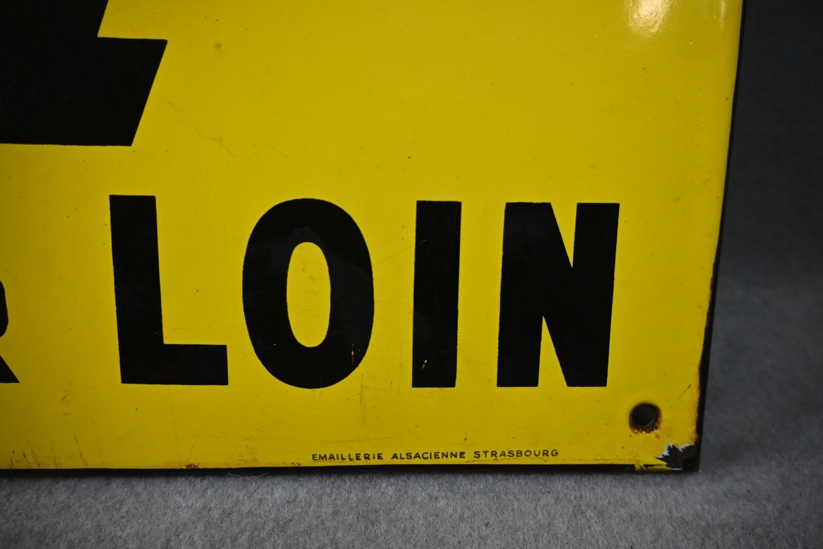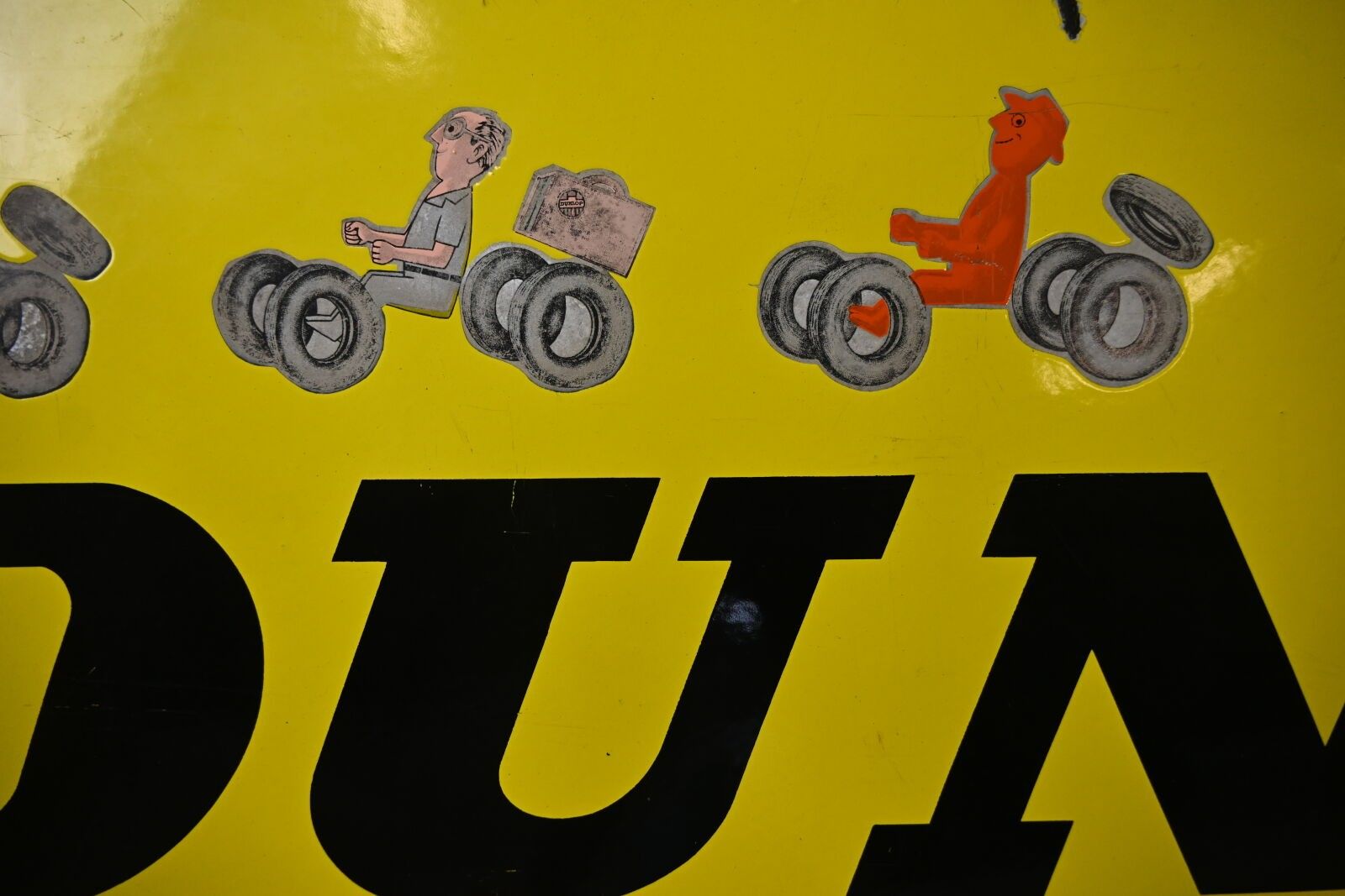 DUNLOP "Pour aller VITE...Pour aller LOIN". Advertising plate in enamelled sheet metal, chamfered rectangle shape, illustrated with the Petit Conducteur à la valise by SAVIGNAC. Émaillerie Alsacienne Strasbourg. Chips, scratches, deformation, restoration. Dimensions: 46 x 146 cm