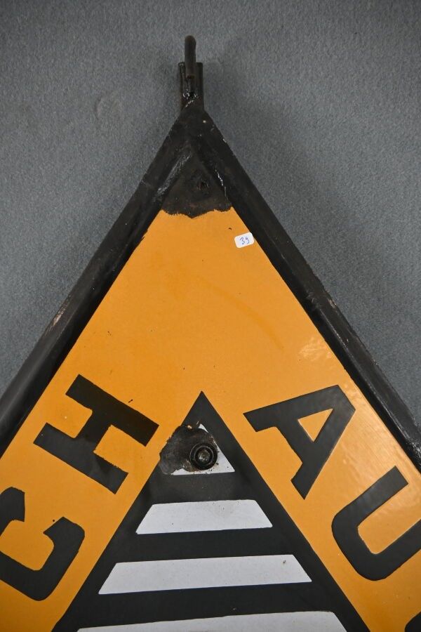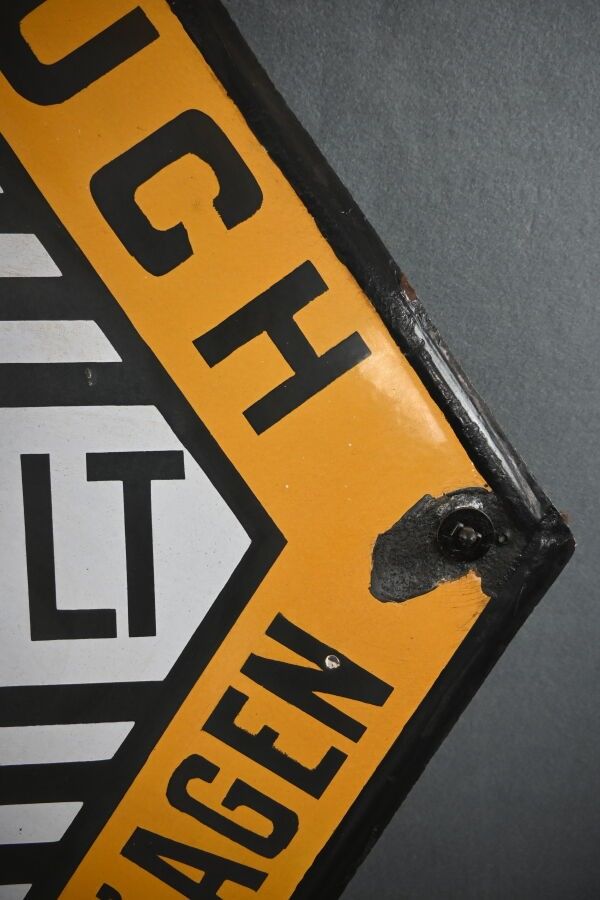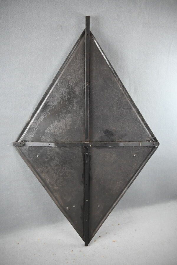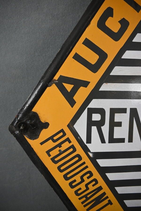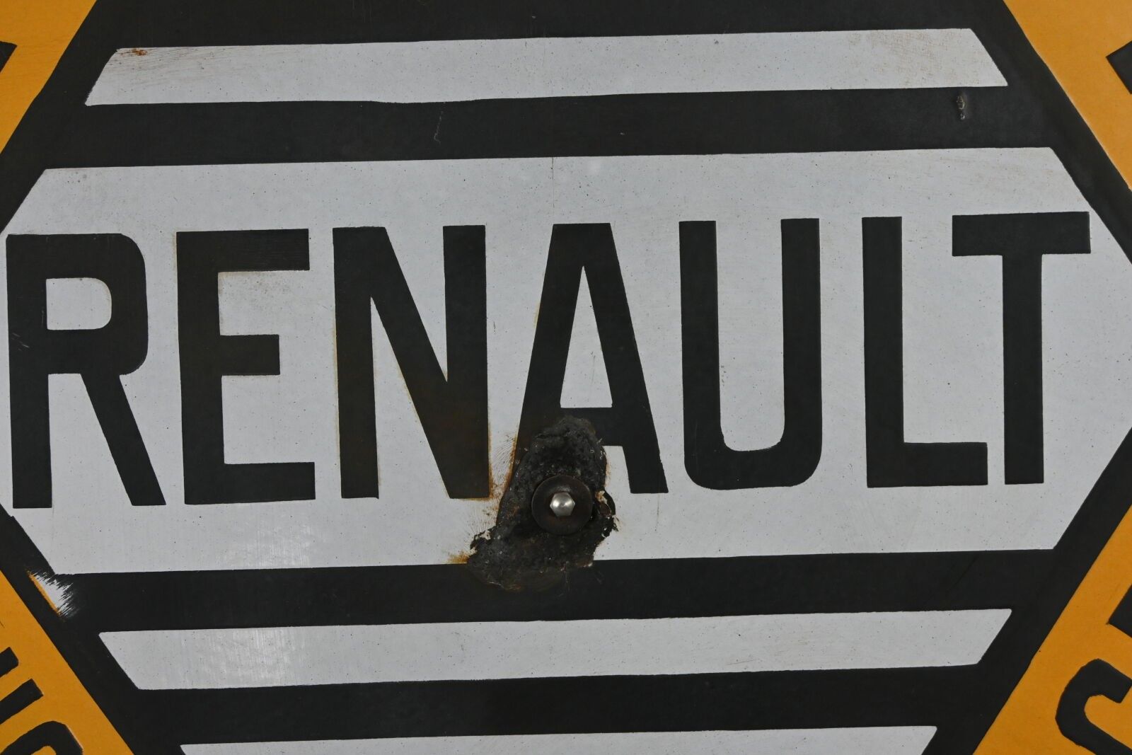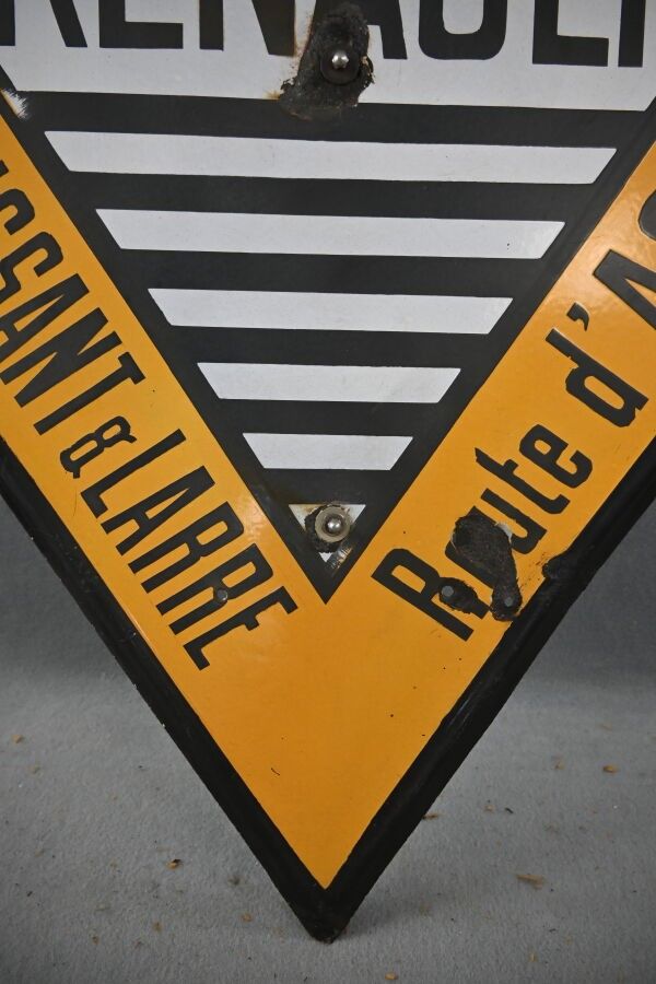 RENAULT PEDOUSSANT & LARRE, Route d'Agen AUCH. Enamelled sheet metal advertising plate in the shape of a diamond, chamfered. Chips, perforations, repaints, deformations. With metal support. Dimensions: 149 x 100 cm.