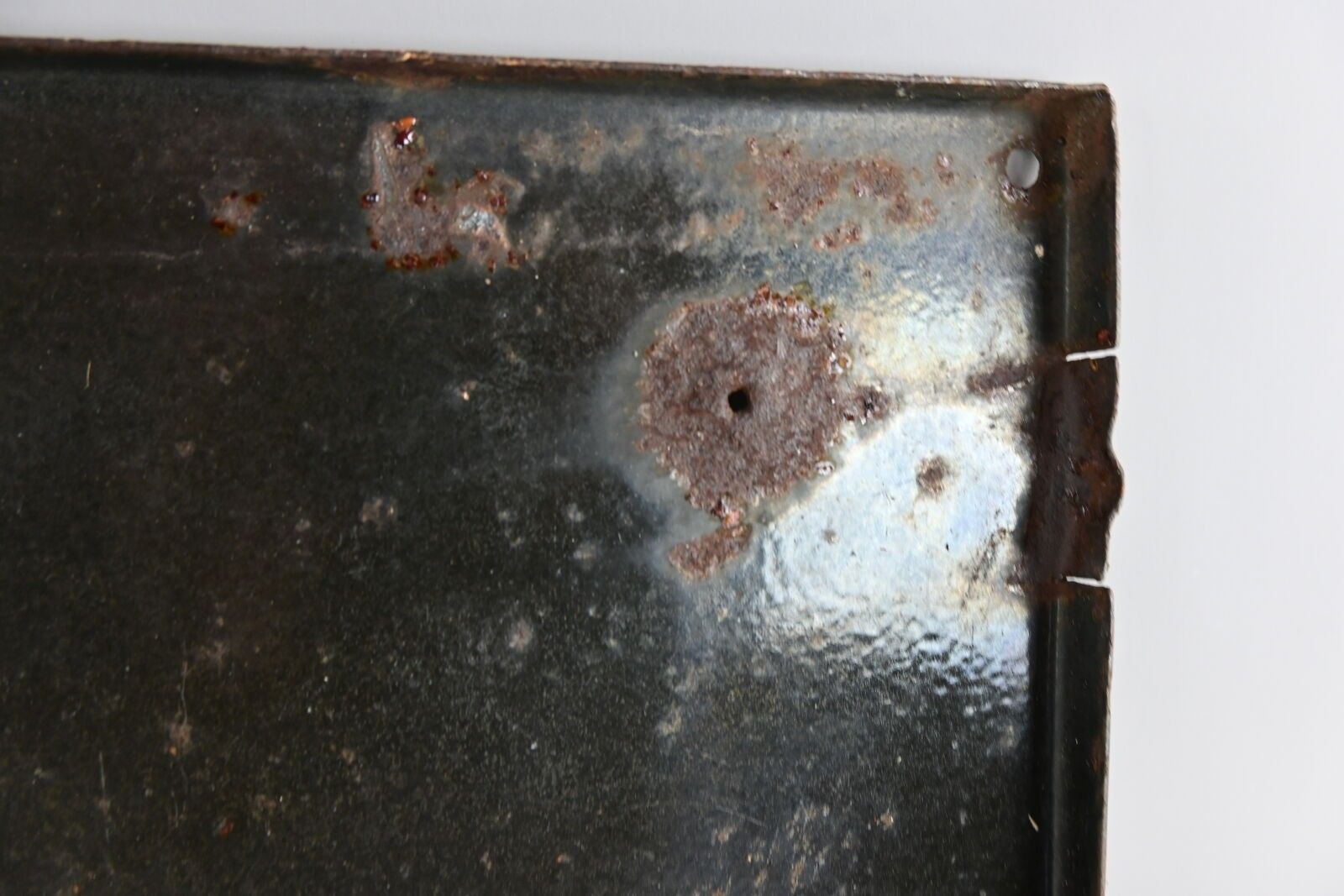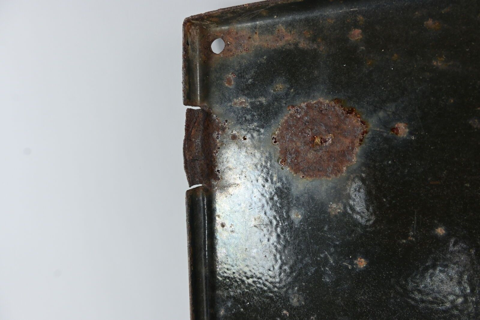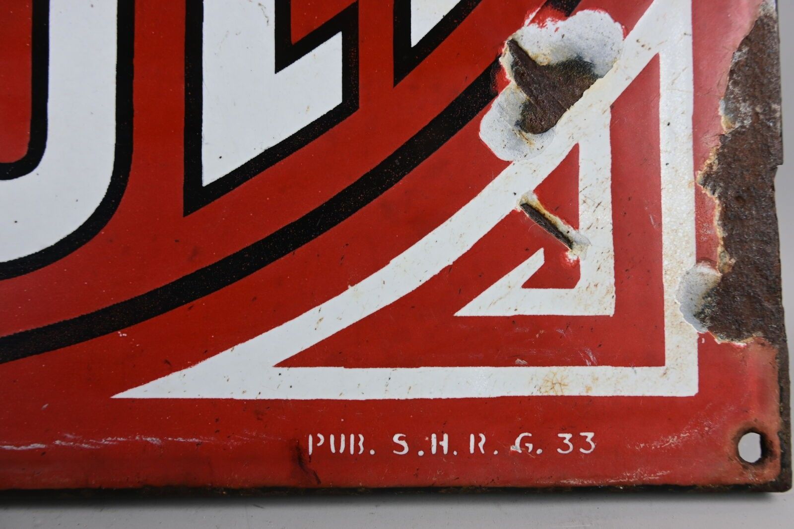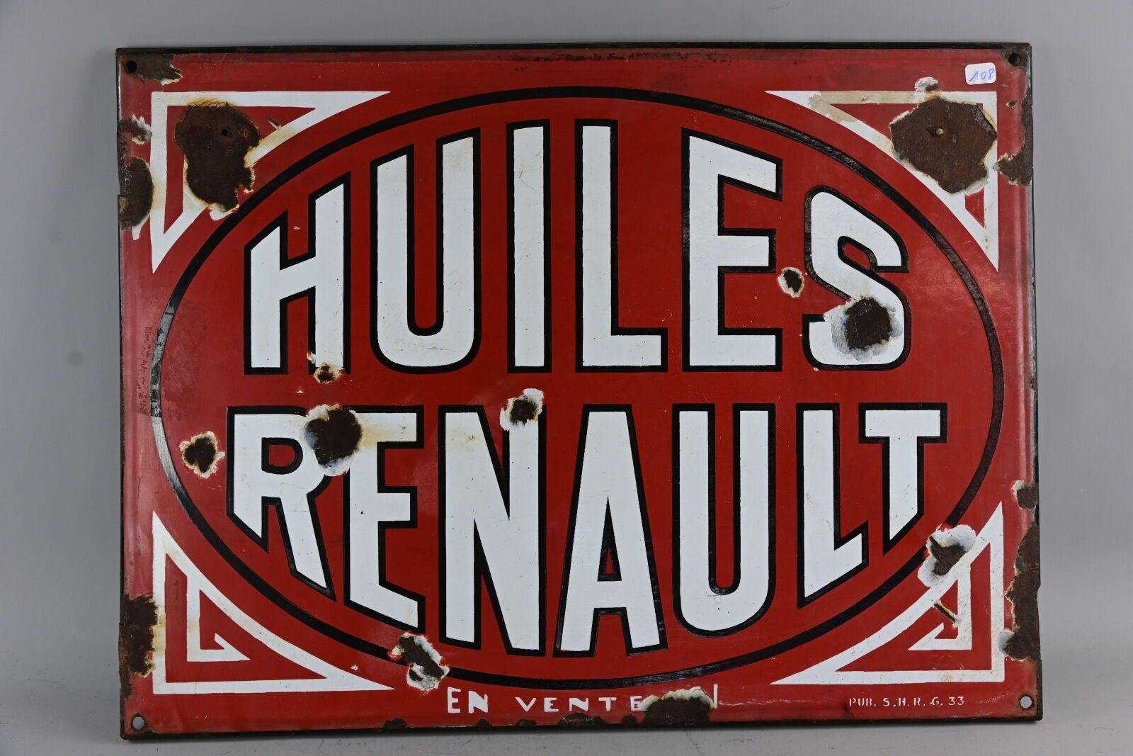 HUILES RENAULT, Advertising plate in enamelled sheet metal, rectangular shape with lining. Advertising S.H.R.G.33. Significant chips, perforations, scratches, cut. Dimensions: 40 x 54 cm.