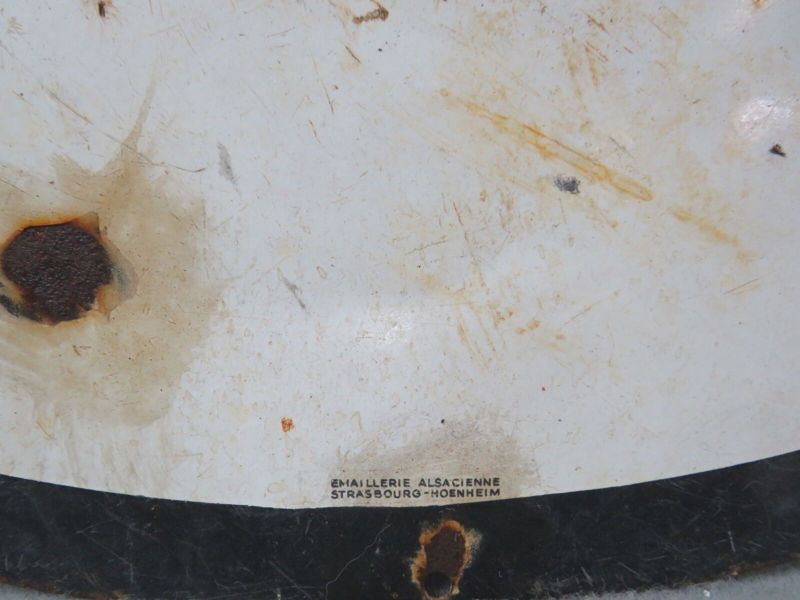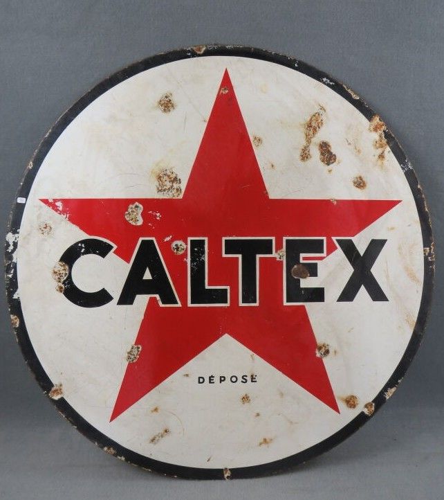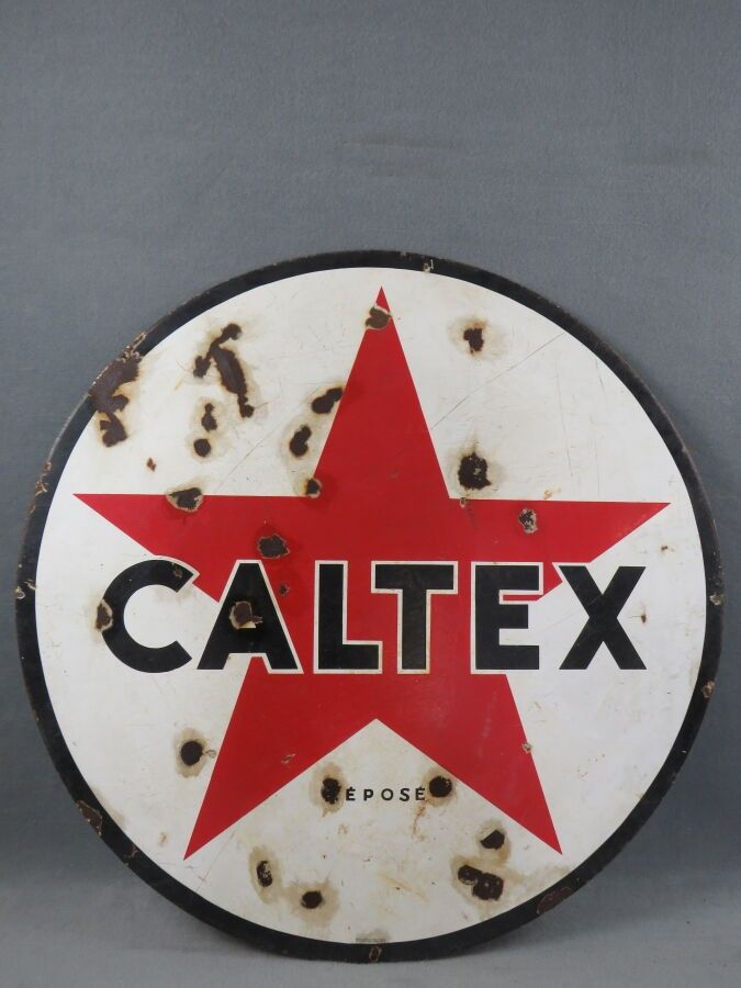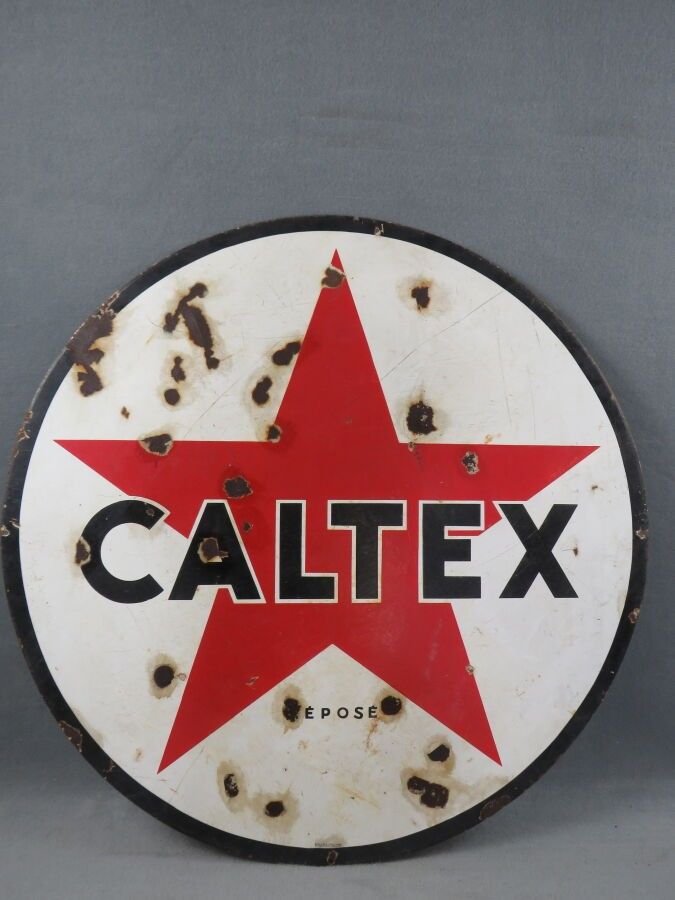 CALTEX, Double-sided circular enamelled sheet metal advertising plate illustrated with the brand emblem. Émaillerie Alsacienne Strasbourg Hoenheim. Chips, scratches, repaints, oxidation. Dimensions: diameter 99.5 cm.