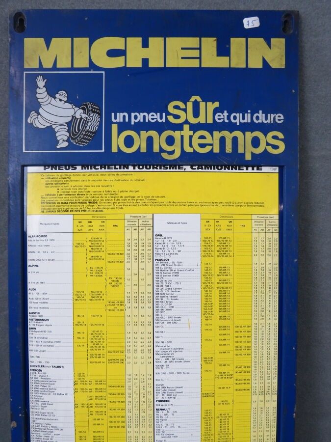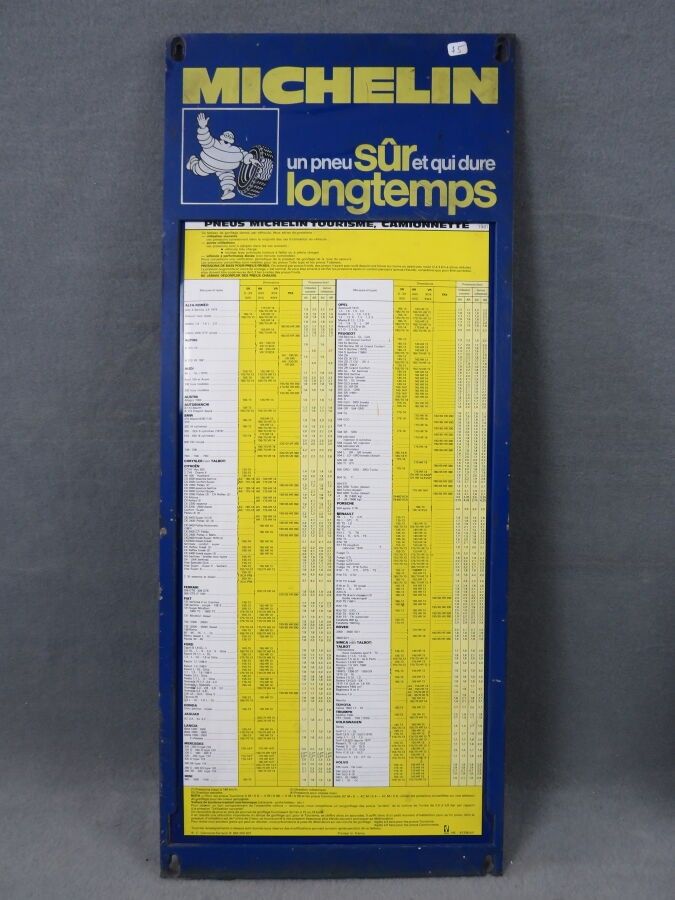 MICHELIN "Un pneu sûr qui dure longtemps" (A safe tyre that lasts a long time), Plastic advertising plate for inflating passenger and light truck tyres. Scratches, missing parts. Dimensions: 82 x 36 cm