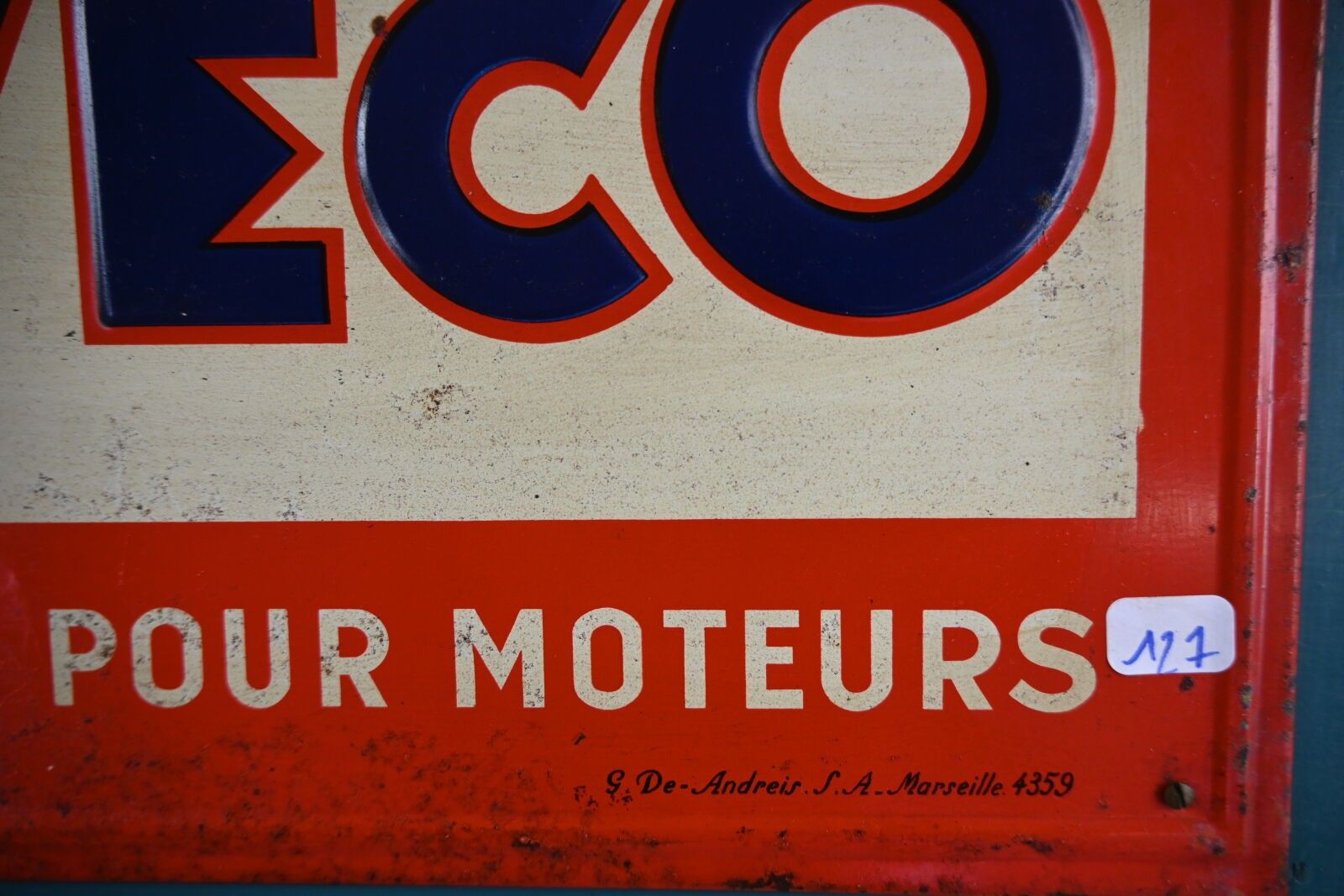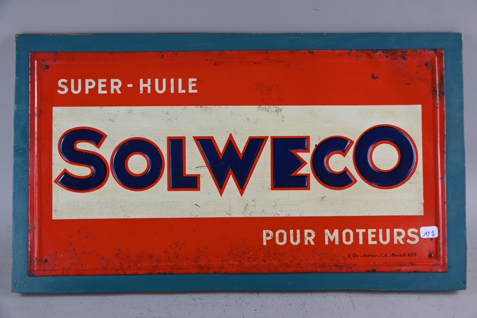 SOLWECO, Super-oil for engines. Advertising plate in chamfered lithographed sheet metal with embossed lettering. G. de Andreis SA Marseille. Oxidation, deformation, missing parts. Marked on a wooden panel. Dimensions: 24 x 44.5 cm.