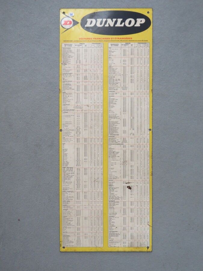 DUNLOP, Lithographed sheet metal advertising plate for inflating tyres on French and foreign cars. Scratches, slight oxidation. Dimensions: 82 x 31.5 cm