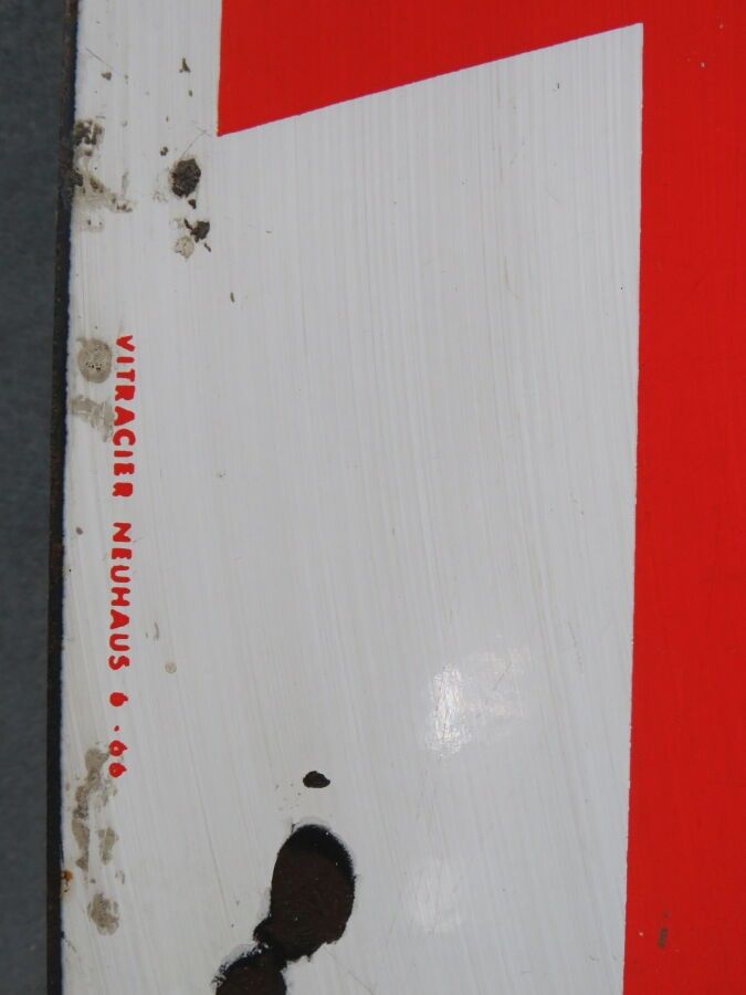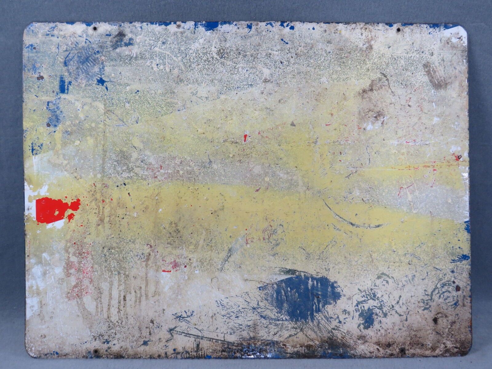 TOTAL, Advertising plate in lithographed sheet metal, rectangular shape, double-sided. Neuhaus stained glass. Chips, scratches, one side covered with cement. Dimensions: 66 x 88 cm.