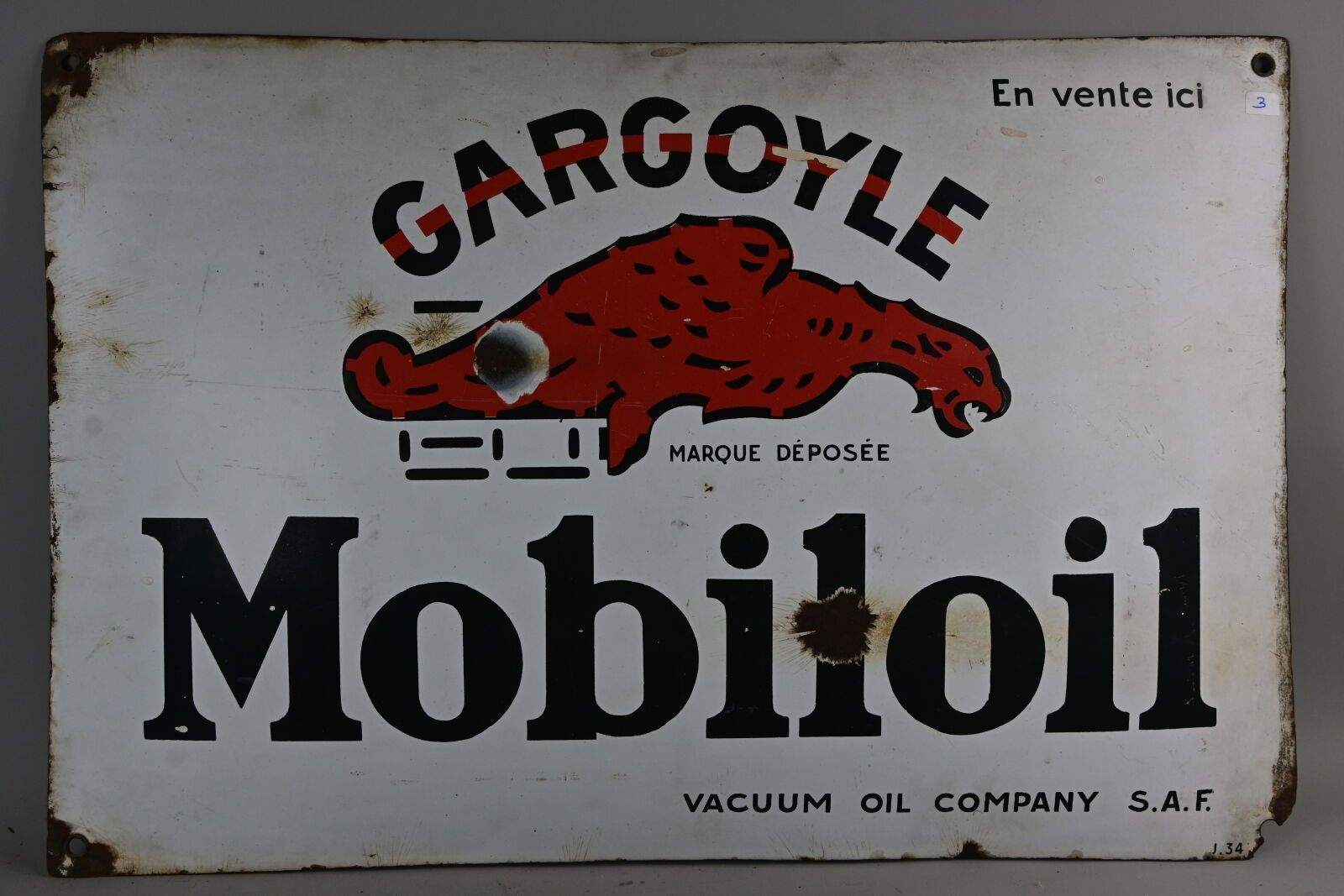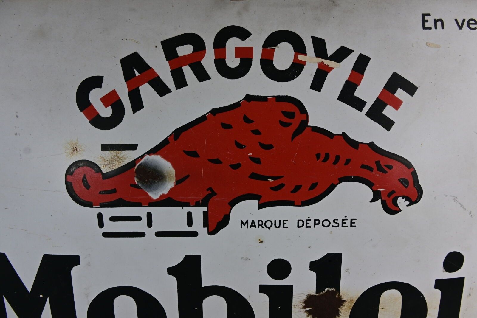 MOBILOIL GARGOYLE, Advertising plate in curved enamelled sheet metal. Chips, scratches, missing parts. Dimensions: 40 x 60 cm.