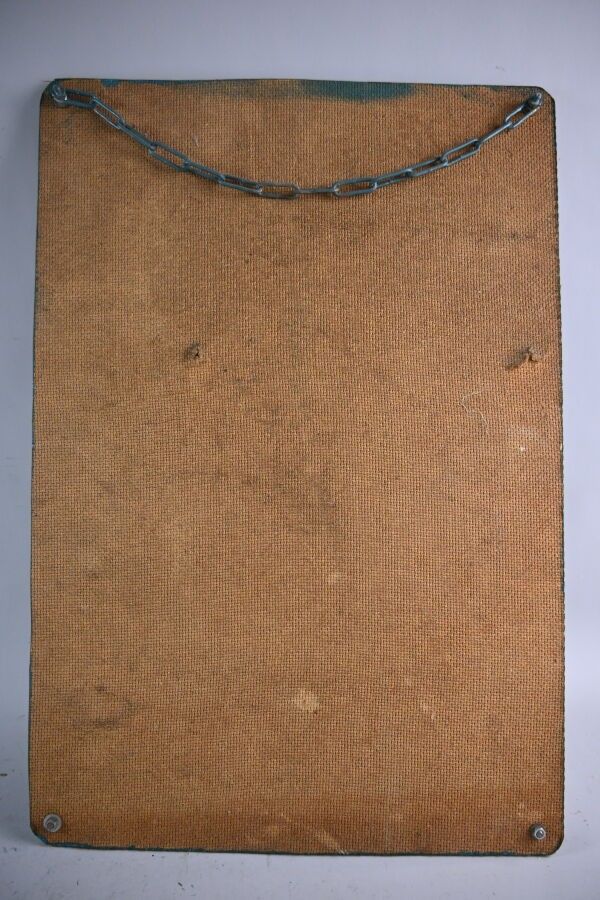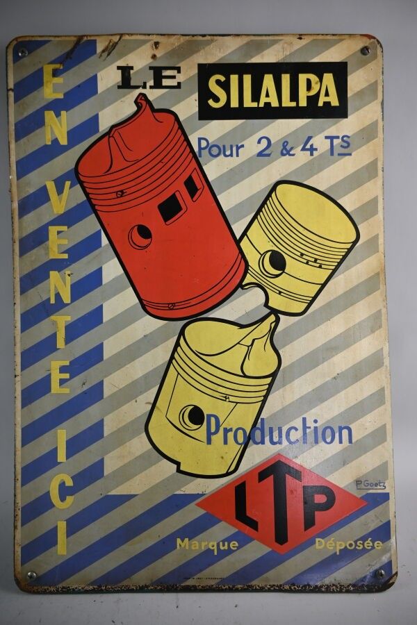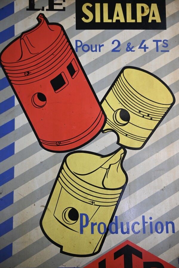 LE SILALPA, LTP production, "for 2 & 4 Ts", lithographed sheet metal advertising plate, illustrated with pistons after P Goetz. Imp M. Jost Strasbourg. Screwed on an isorel, scratches, lacks, deformations. Size : 50 x 34 cm