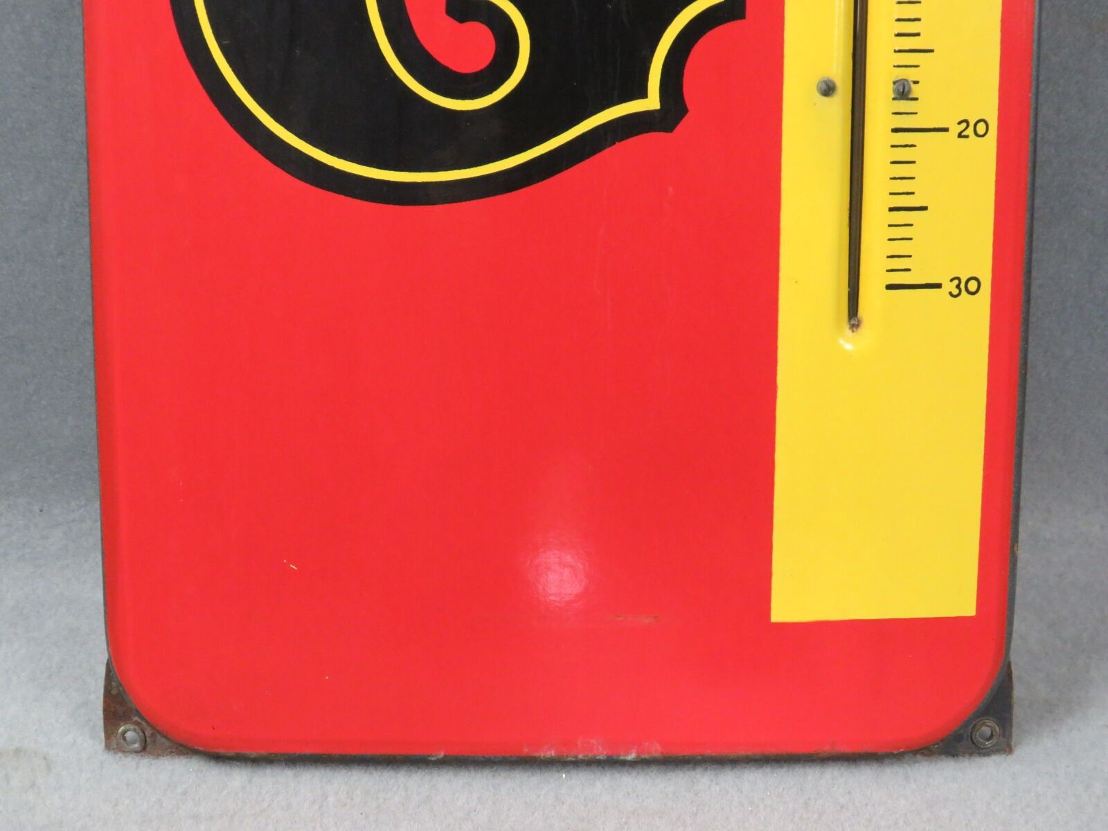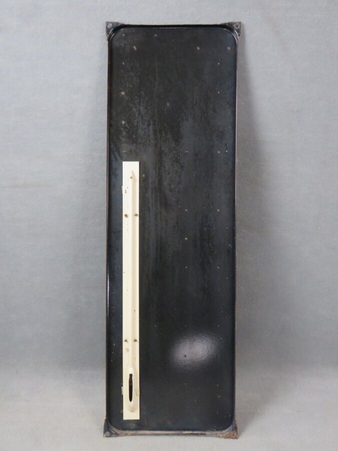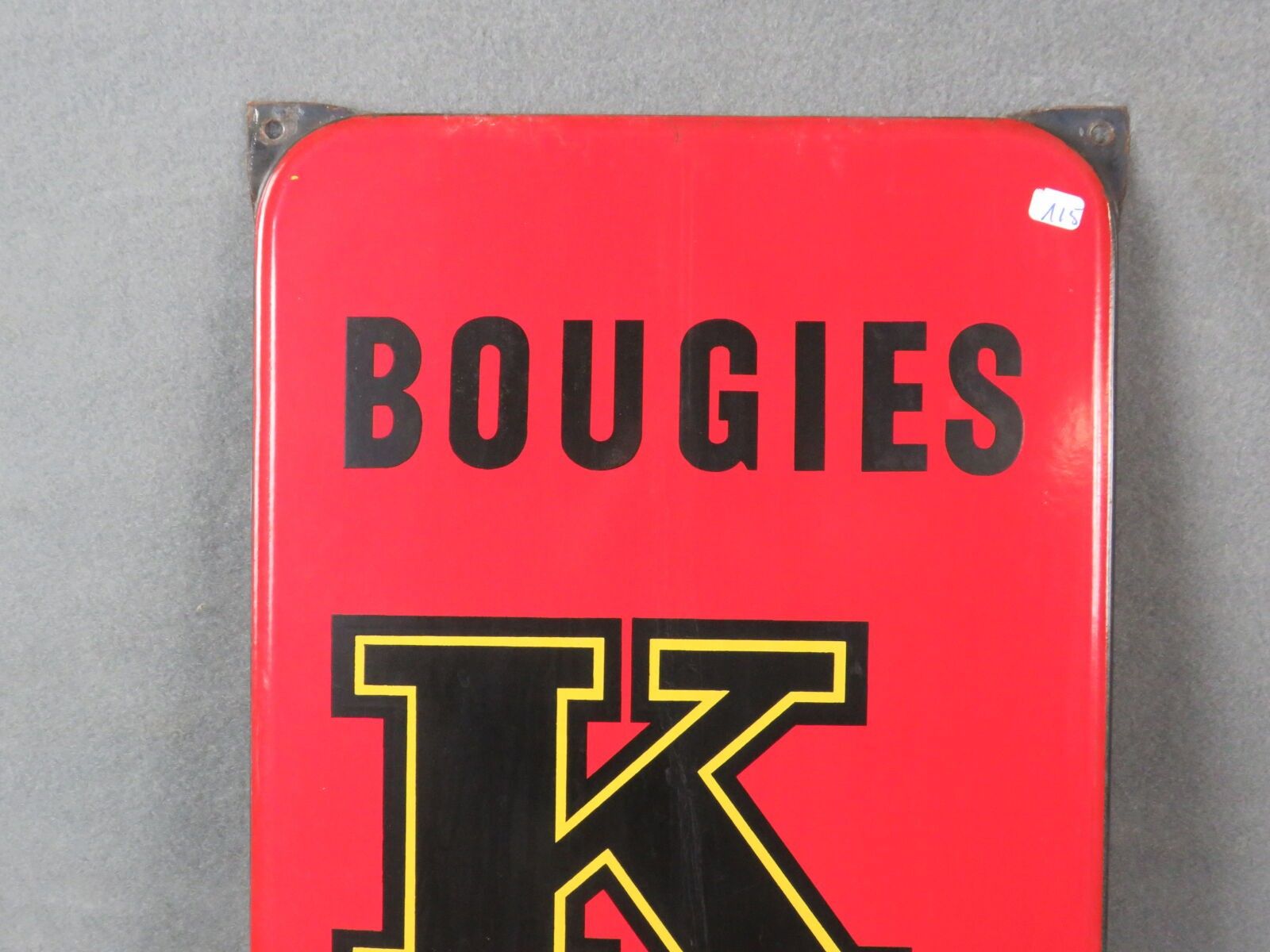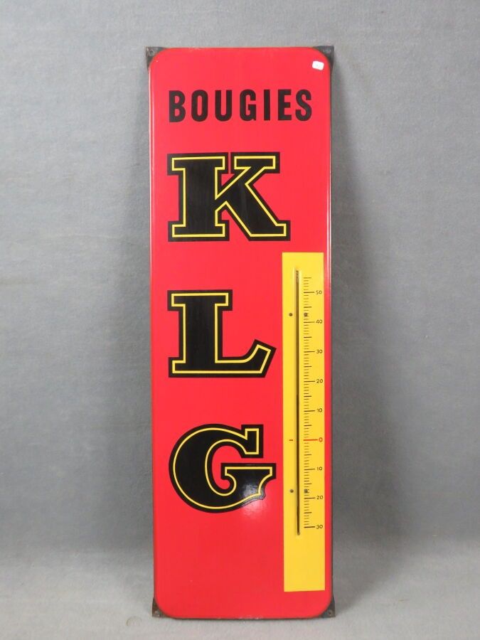BOUGIES KLG, Advertising thermometer plate in enamelled sheet metal, rectangular shape, padded, with ears. Scratches. Dimensions: 98 x 31 cm.