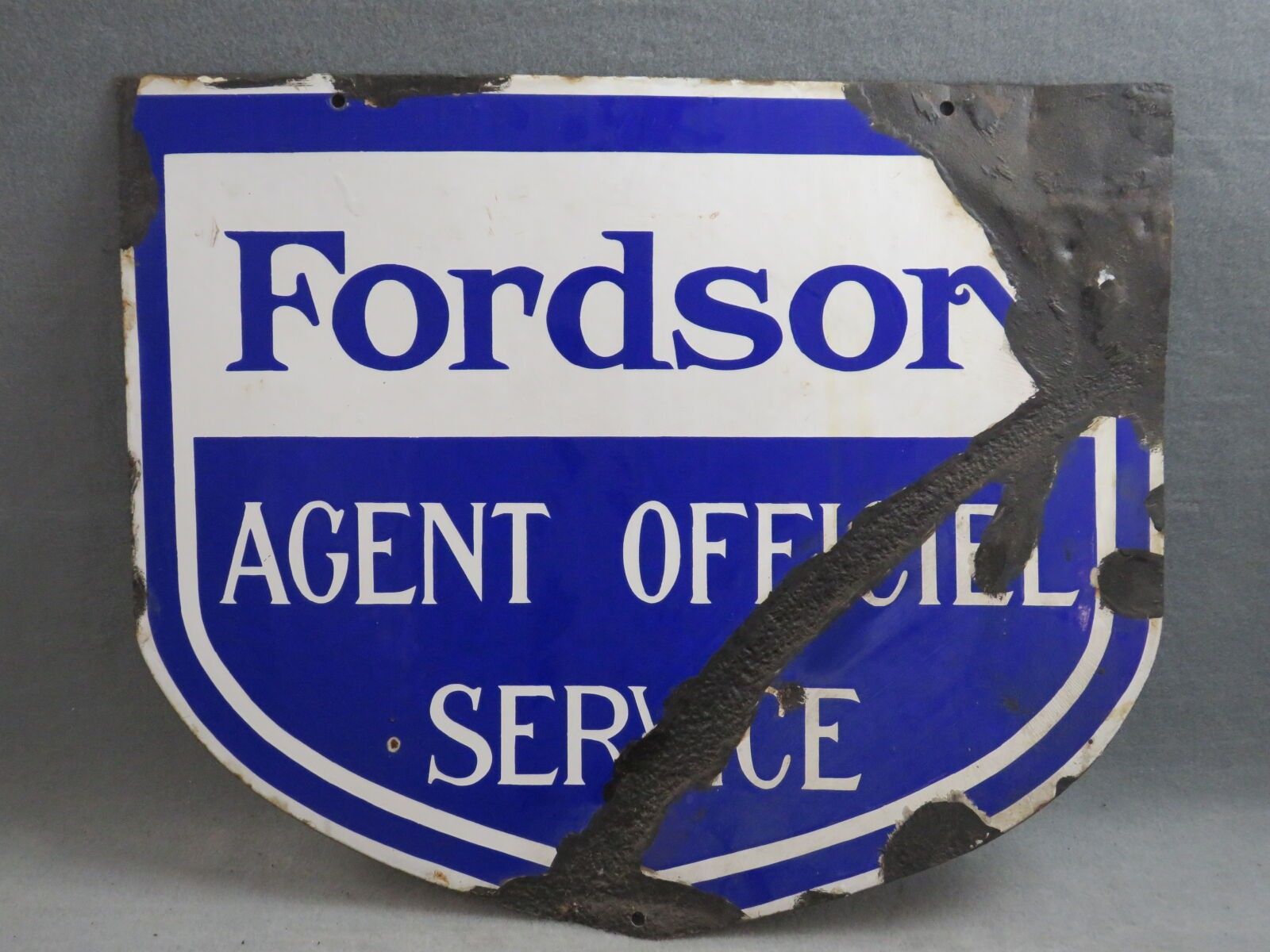 FORDSON Official Service Agent. Advertising plate in enamelled sheet metal. Significant chips, deformations, repaints, scratches. Dimensions: 60.5 x 73 cm.