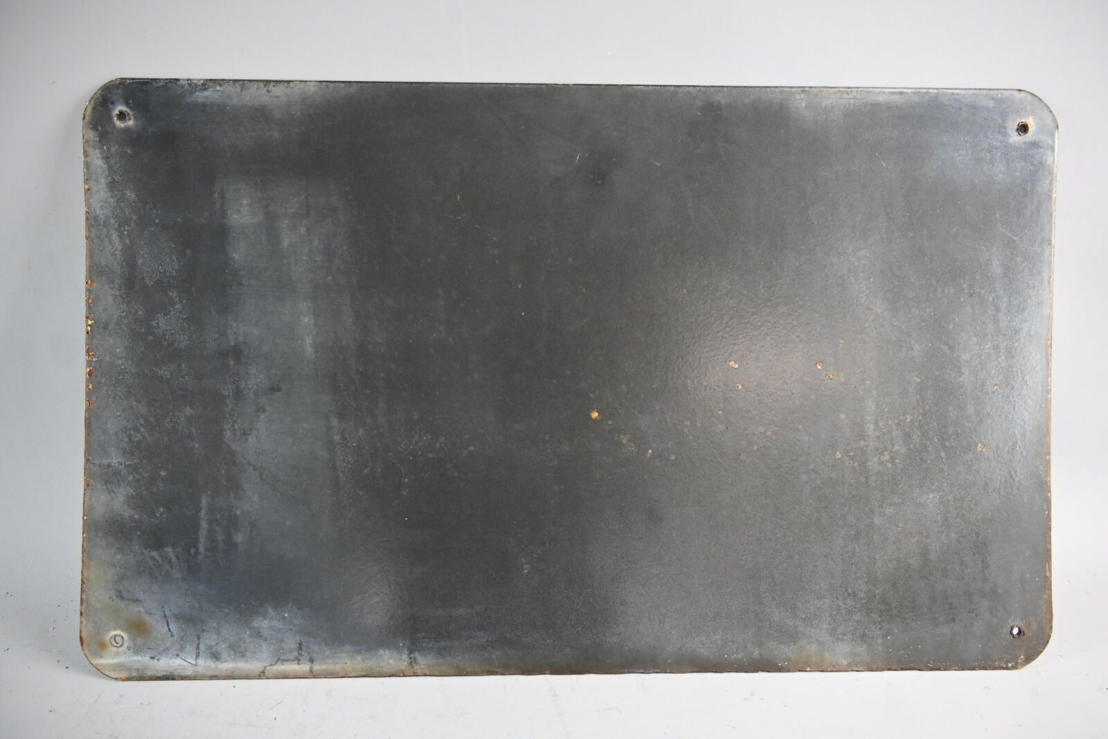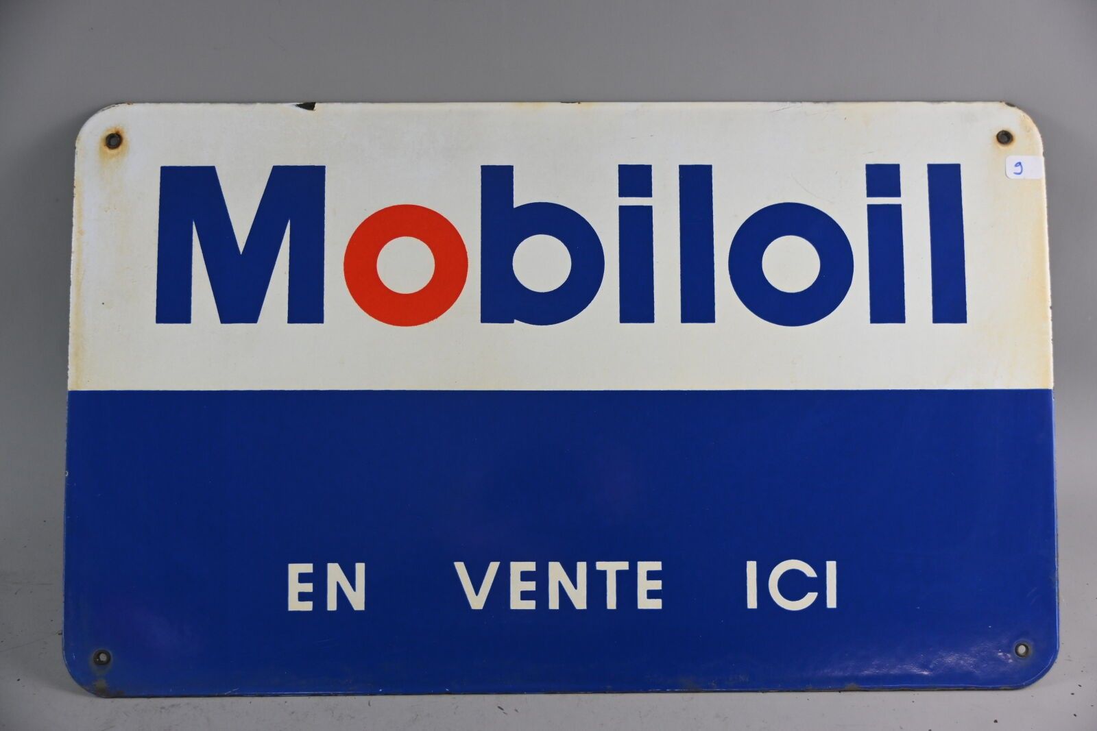 MOBILOIL, "On sale here", rectangular enamelled sheet metal advertising plaque. Slight chips and scratches. Dimensions: 29 x 48 cm.