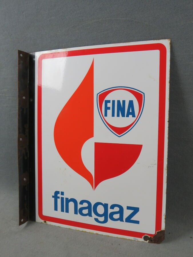 FINA FINAGAZ. Advertising plate in enamelled sheet metal, rectangular shape, double-sided at right-angles, illustrated with the flame. Hexa. Chips, scratches, missing parts. Dimensions: 60 x 48.5 cm.