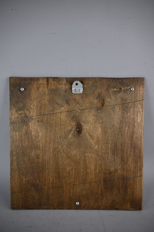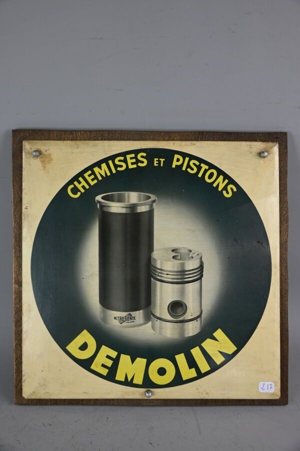 DEMOLIN "Shirts and Pistons", square-shaped advertising box illustrated with DEMOLIN shirts and pistons. Scratches. Mounted on plywood. Dimensions 29 x 29 cm.