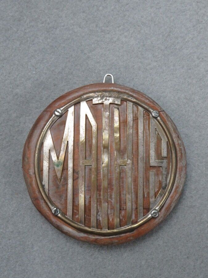 MATHIS, Metal automobile badge. Deformations. Size: 10.5 cm. On a wooden stand