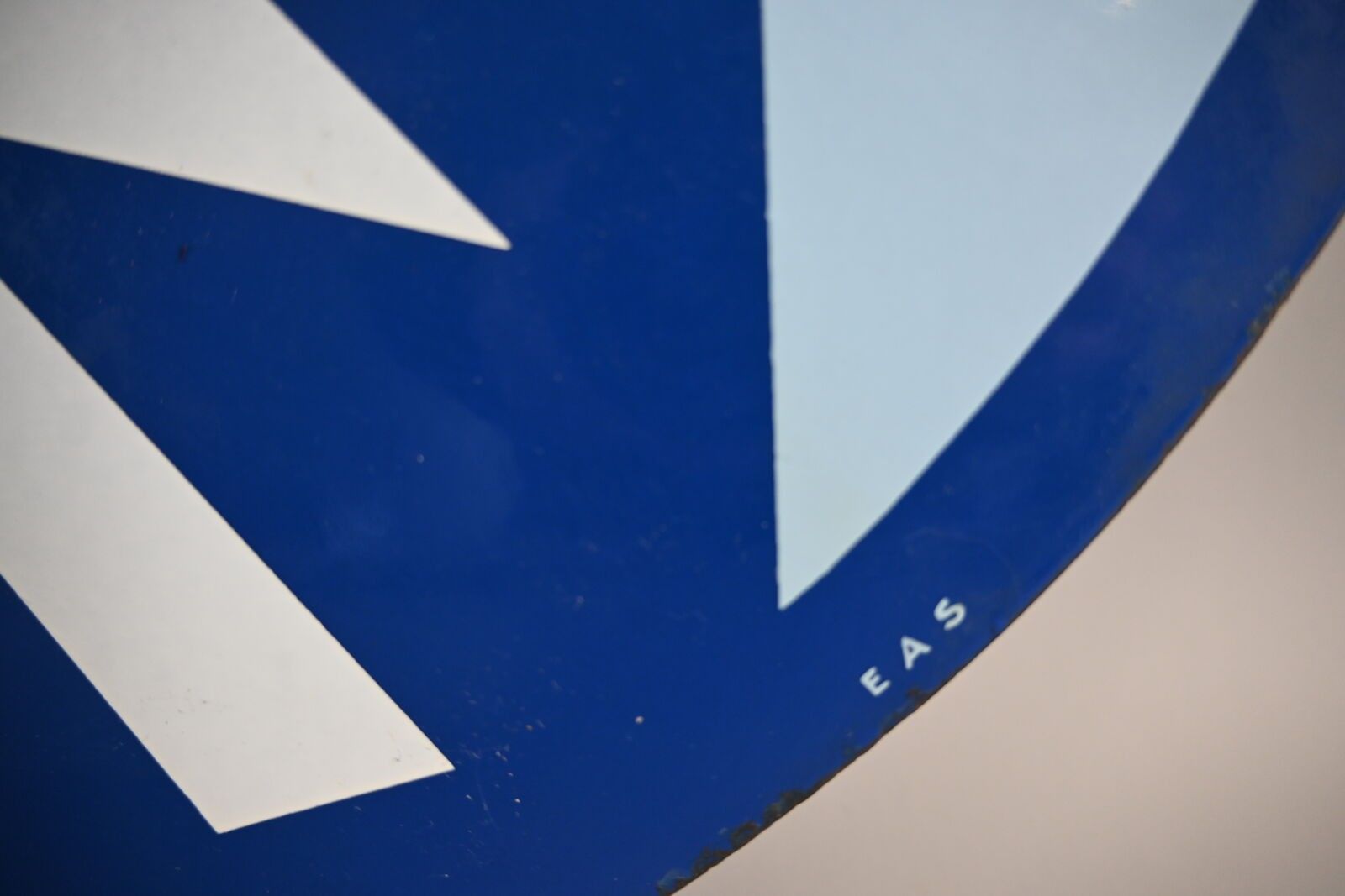 BAROCLEM Accus, Advertising plate in enamelled sheet metal in the shape of a pennant, double-sided. EAS. Slight chips, scratches. Dimensions: 60 x 39.5 cm.