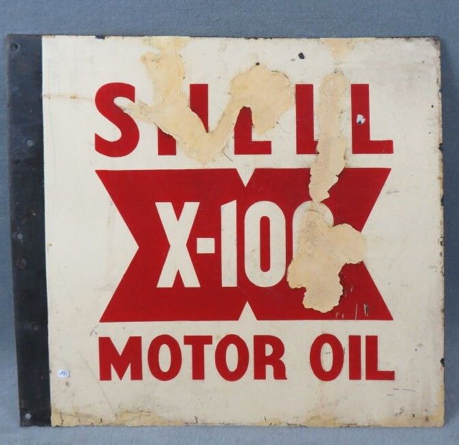 SHELL X-100 MOTOR OIL. Advertising plaque in enamelled sheet metal, rectangular in shape, originally square, double-sided. Very badly damaged and repainted. Square cut off. Dimensions: 59.5 x 65 cm.