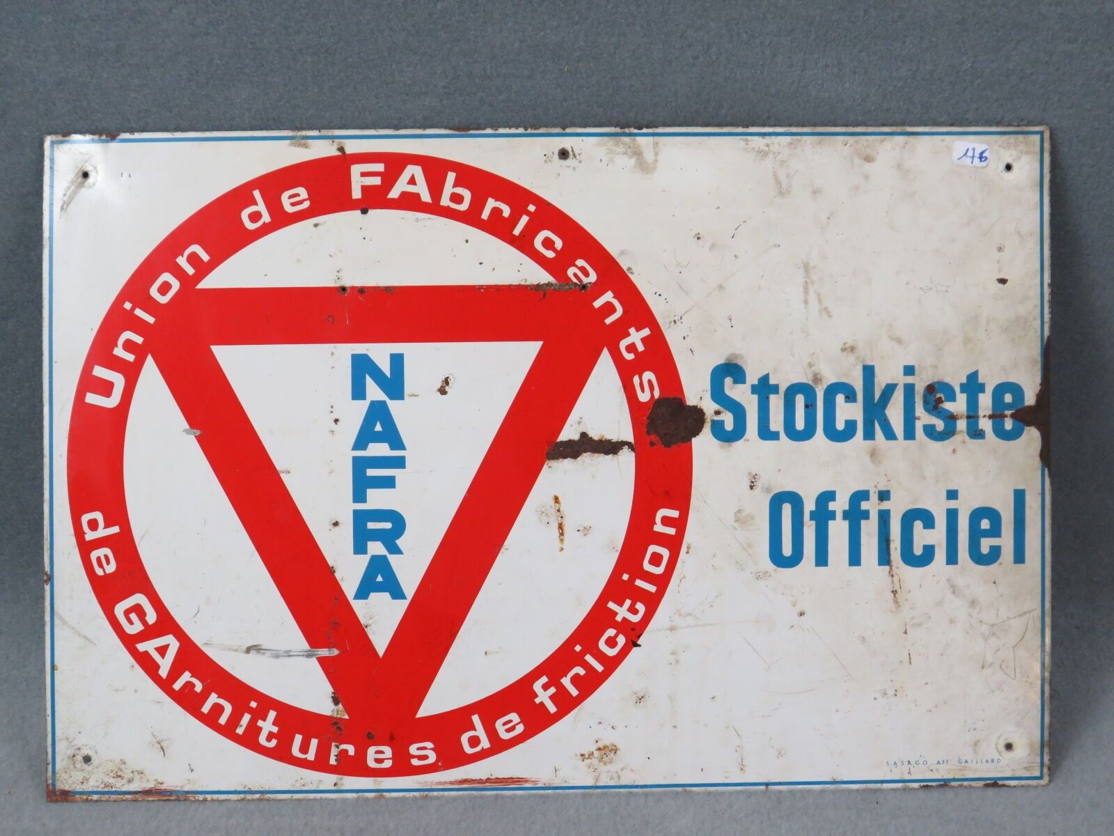 NAFRA, Advertising plate in lithographed sheet metal, rectangular shape. SAS AGO Gayard. Missing parts, oxidation. Dimensions: 33 x 50 cm. Mounted on a chipboard panel.