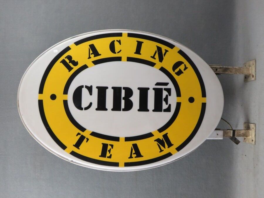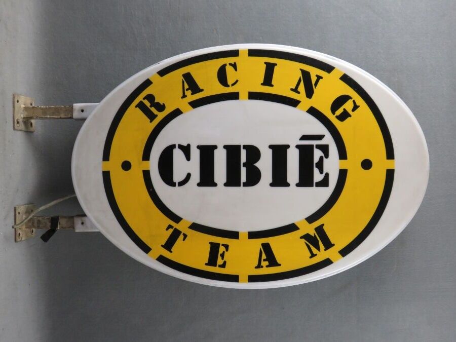 CIBIE RACING TEAM, Double-sided illuminated advertising sign on gallows. Scratches, accidents, missing parts. Total dimensions: 70 x 118 x 16 cm. Not tested.