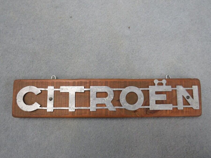 CITROEN, Aluminium car badge. Deformations. Dimensions: l. 31 cm. On a wooden stand