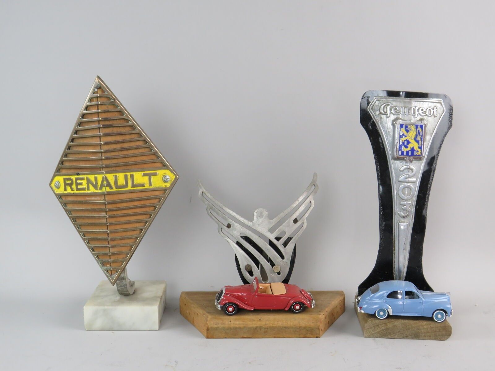 PEUGEOT 203, CITROEN TRACTION 11BL, 2 badges of calendars, presented on wooden supports and decorated with a miniature car. Damage. Attached is a RENAULT grille badge on a marble base.
