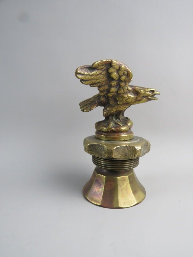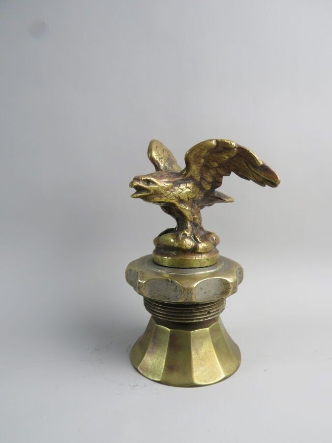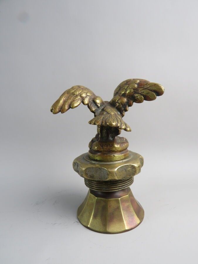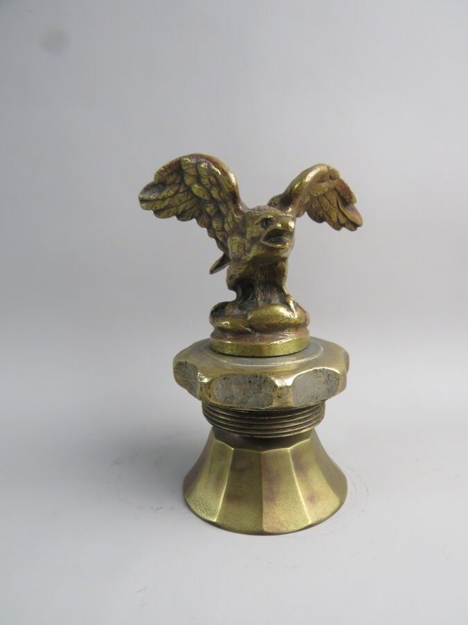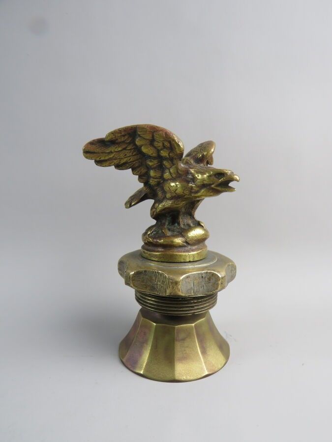 Gilded bronze mascot, featuring an eagle, mounted on a radiator cap, itself mounted on a pedestal. Overall dimensions: h. 13 cm