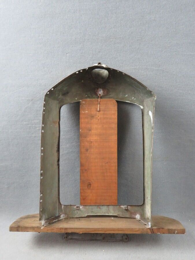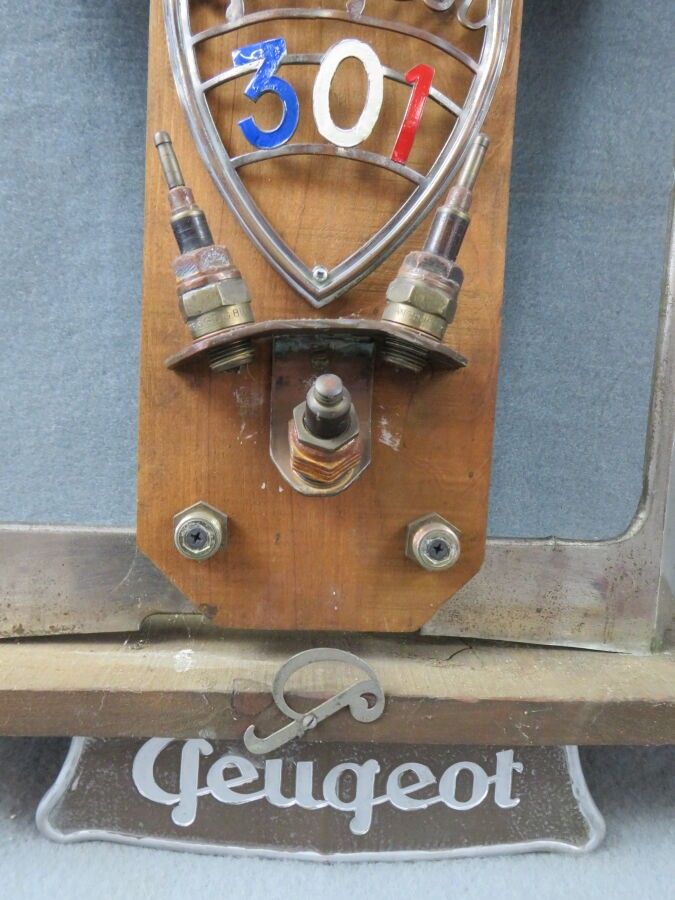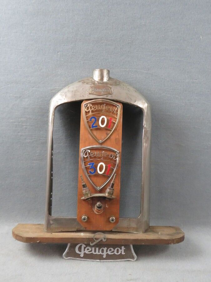 PEUGEOT, Automobile grille, decorated with 2 Peugeot 201 and Peugeot 301 badges, and 3 candles on a wooden support. The whole on a wooden stand supporting a Peugeot aluminium plate. Damage and repainting. Total dimensions: 67 x