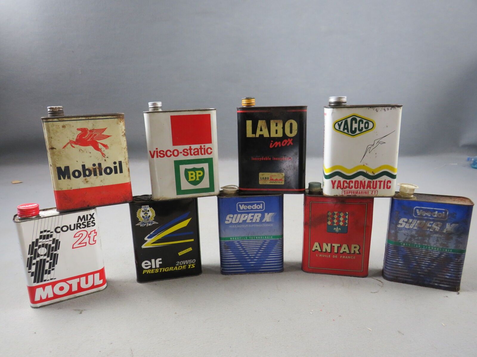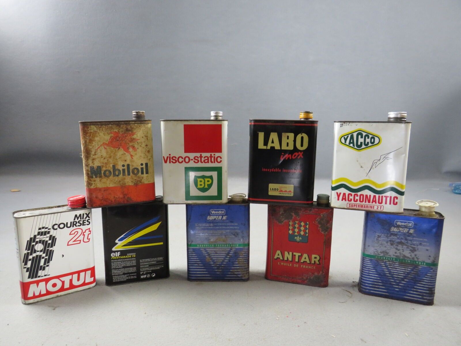 LABO, MOBILOIL, ANTAR, BP, MOTUL, VEEDOL, ELF, YACCO, Meeting of 9 oil cans in lithographed sheet metal. Accidents.