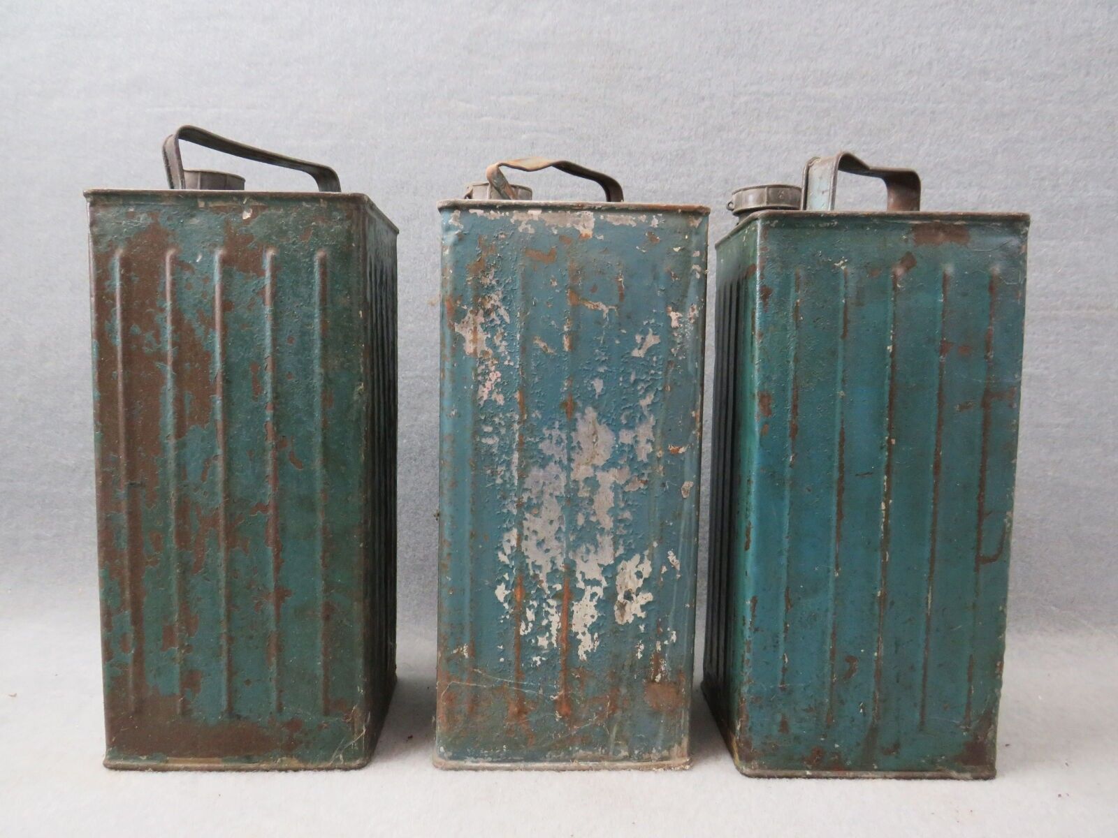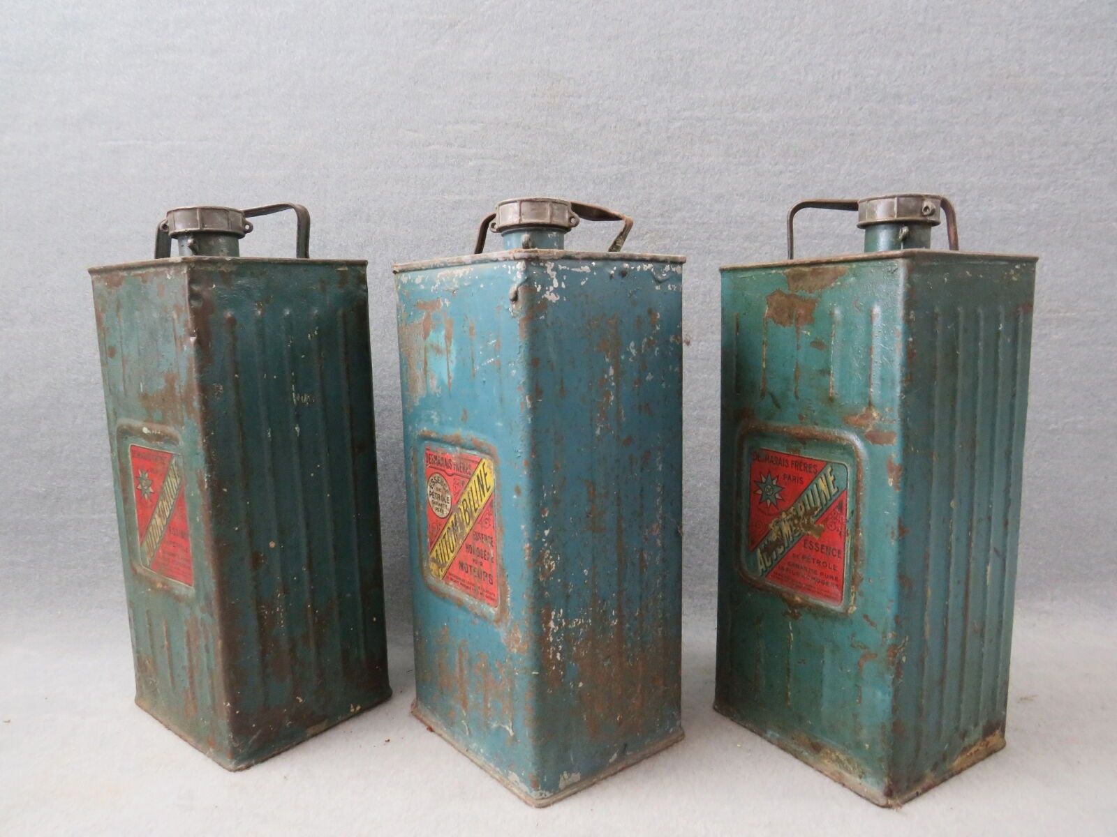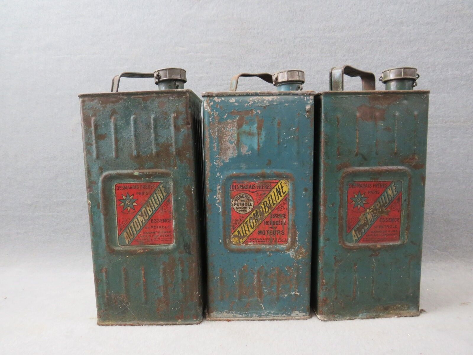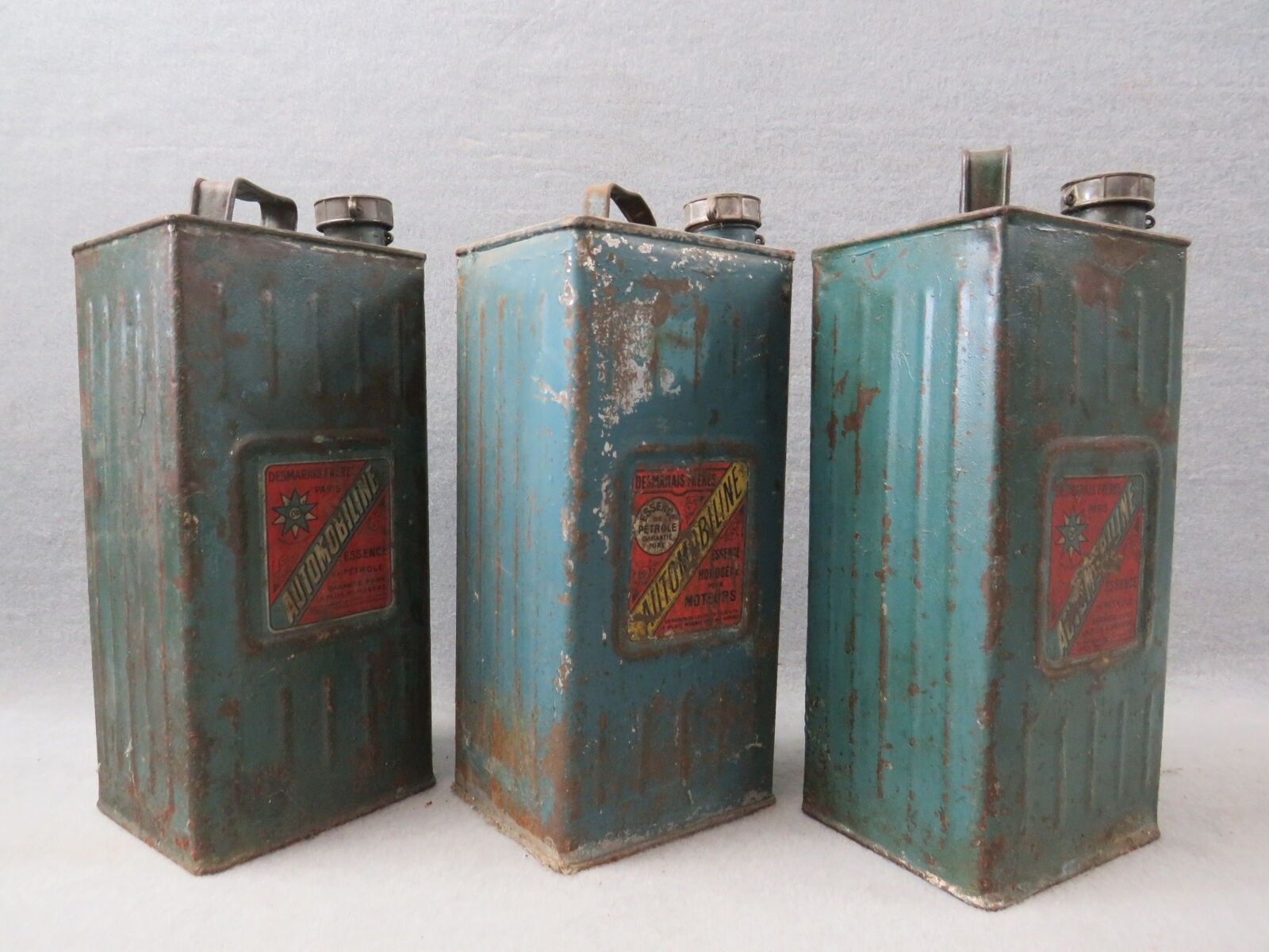 AUTOMOBILINE, DESMARAIS FRERES, 3 blue lithographed tin cans: Essence de Pétrole and Essence homogène pour moteurs. Missing, worn, banged. Dimensions of each: 34.5 x 14.5 x 12.5 cm