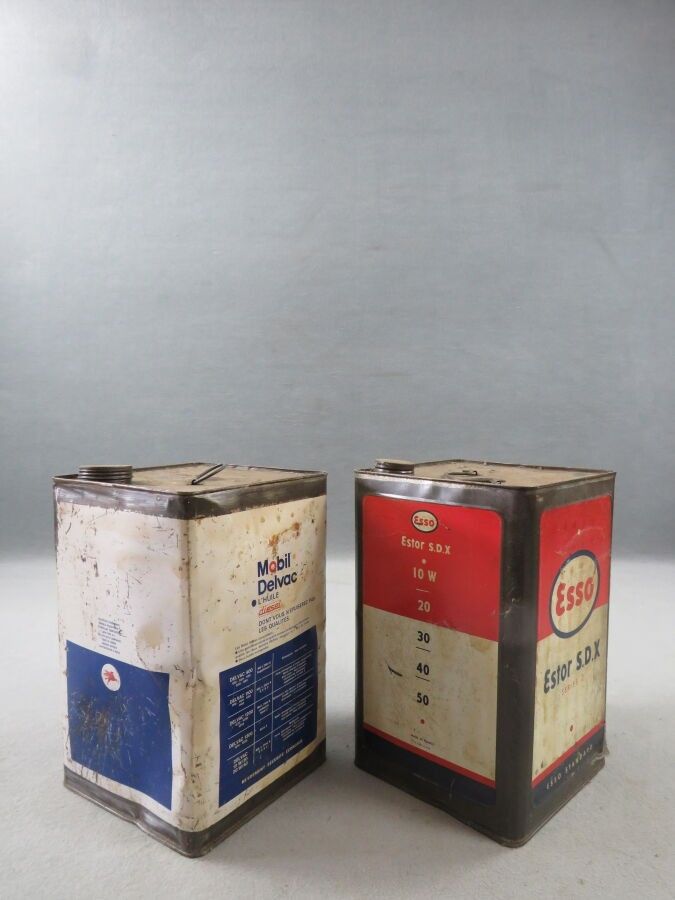 MOBIL and ESSO, Meeting of 2 lithographed sheet metal 20-litre drums. Scratches, bumps, missing parts.
