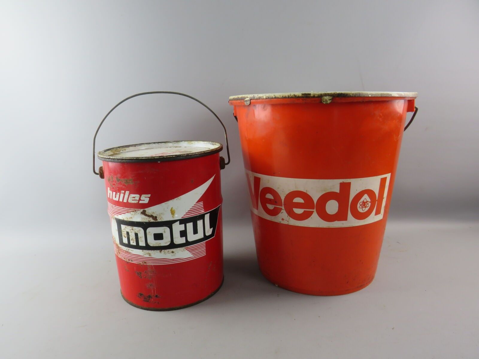 VEEDOL, Plastic bucket; MOTUL, Lithographed sheet metal buck…