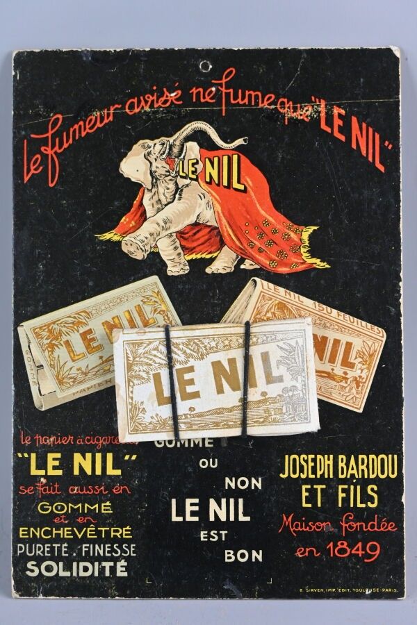 LE NIL, "Le Fumeur avisé ne fume que le Nil", Advertising cardboard, illustrated with a pack of the brand's rolling papers. B. Sirven Imp. Edit. Toulouse Paris. Wear and tear. Dimensions : 21 x 15 cm