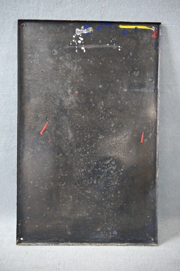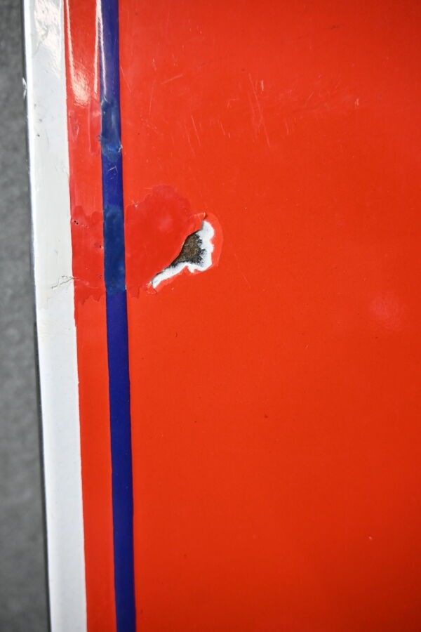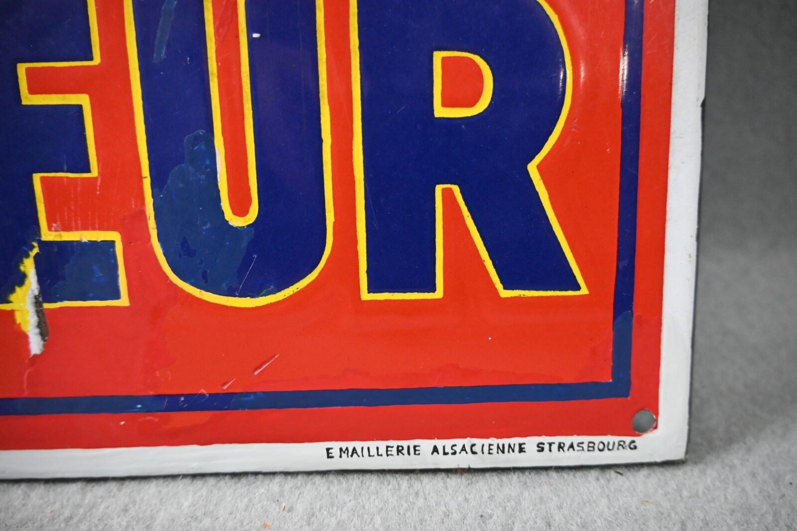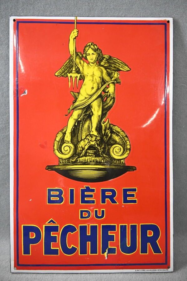 BIERE DU PECHEUR, Advertising plate in enamelled sheet metal, rectangular shape, padded. Émaillerie Alsacienne Strasbourg. Chips, scratches, repaints, restorations. Dimensions: 75 x 48 cm