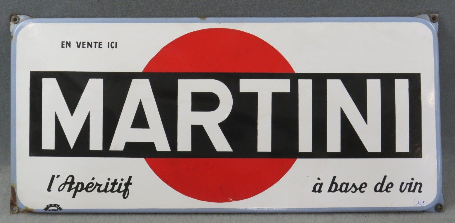 MARTINI, "l'Apéritif à base de vin". Advertising plate in enamelled sheet metal, rectangular shape with lugs. PRA Amiens. Chips, scratches. Dimensions: 30 x 66 cm.