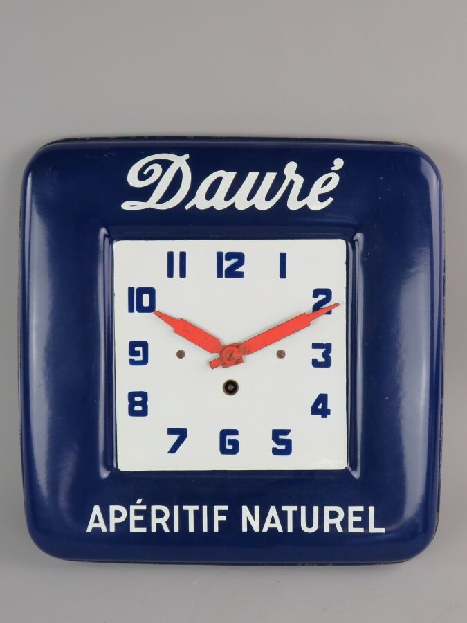 DAURE, Apéritif Naturel, Square enamelled sheet metal advertising clock. No key, untested, slight enamelling. Dimensions: 32 x 32 cm