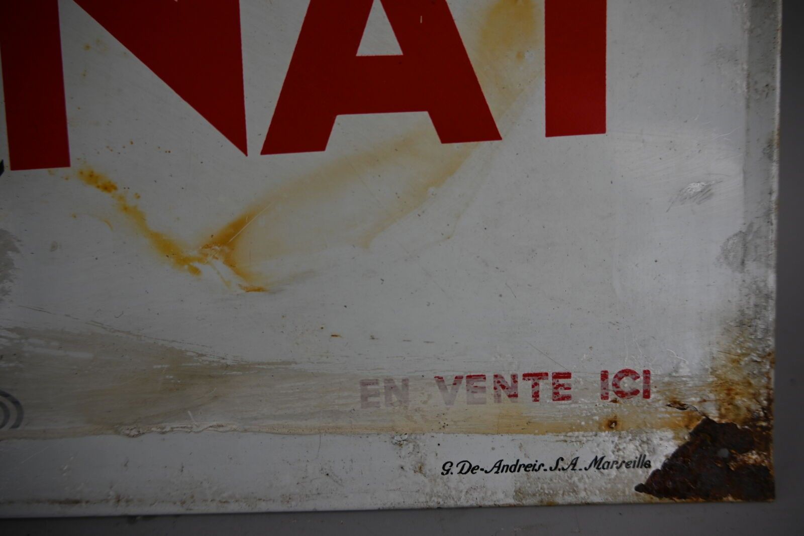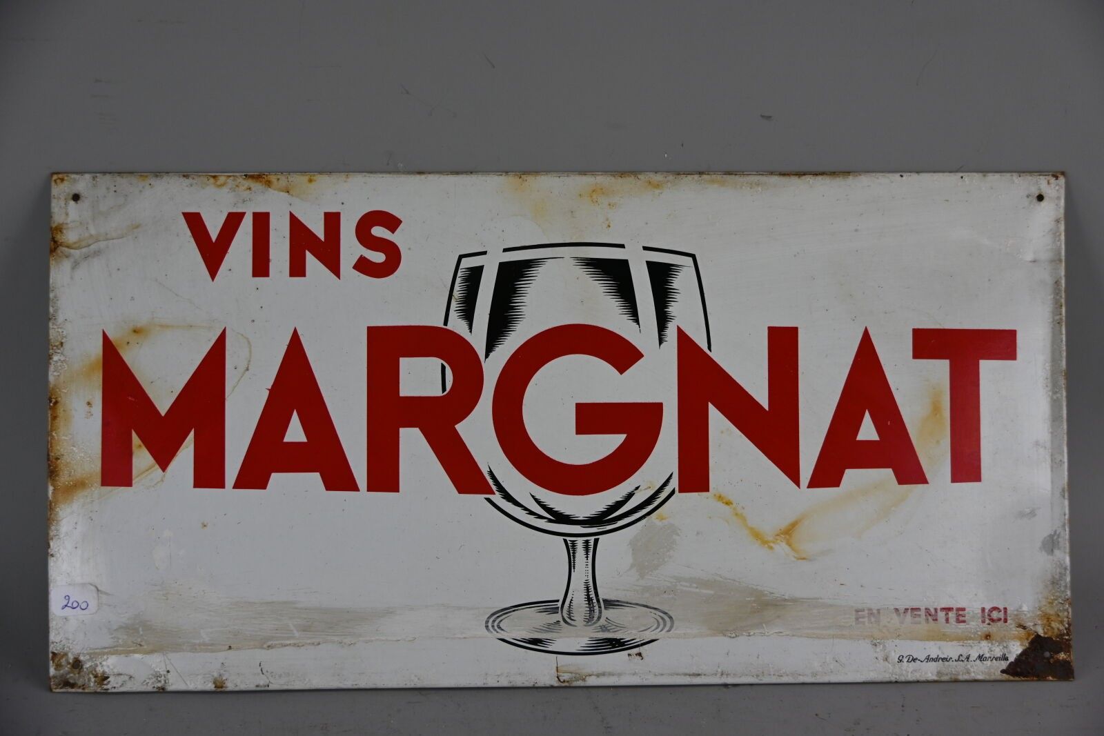 VINS MARGNAT, Advertising plate in lithographed sheet metal, rectangular shape, illustrated with a stemmed glass. G. de Andreis SA Marseille. Scratches, missing parts, deformations. Dimensions: 20 x 40 cm.