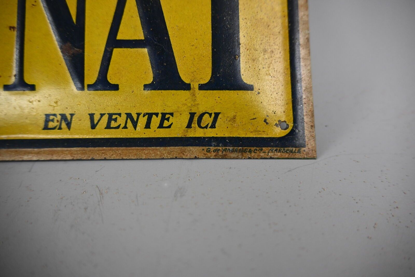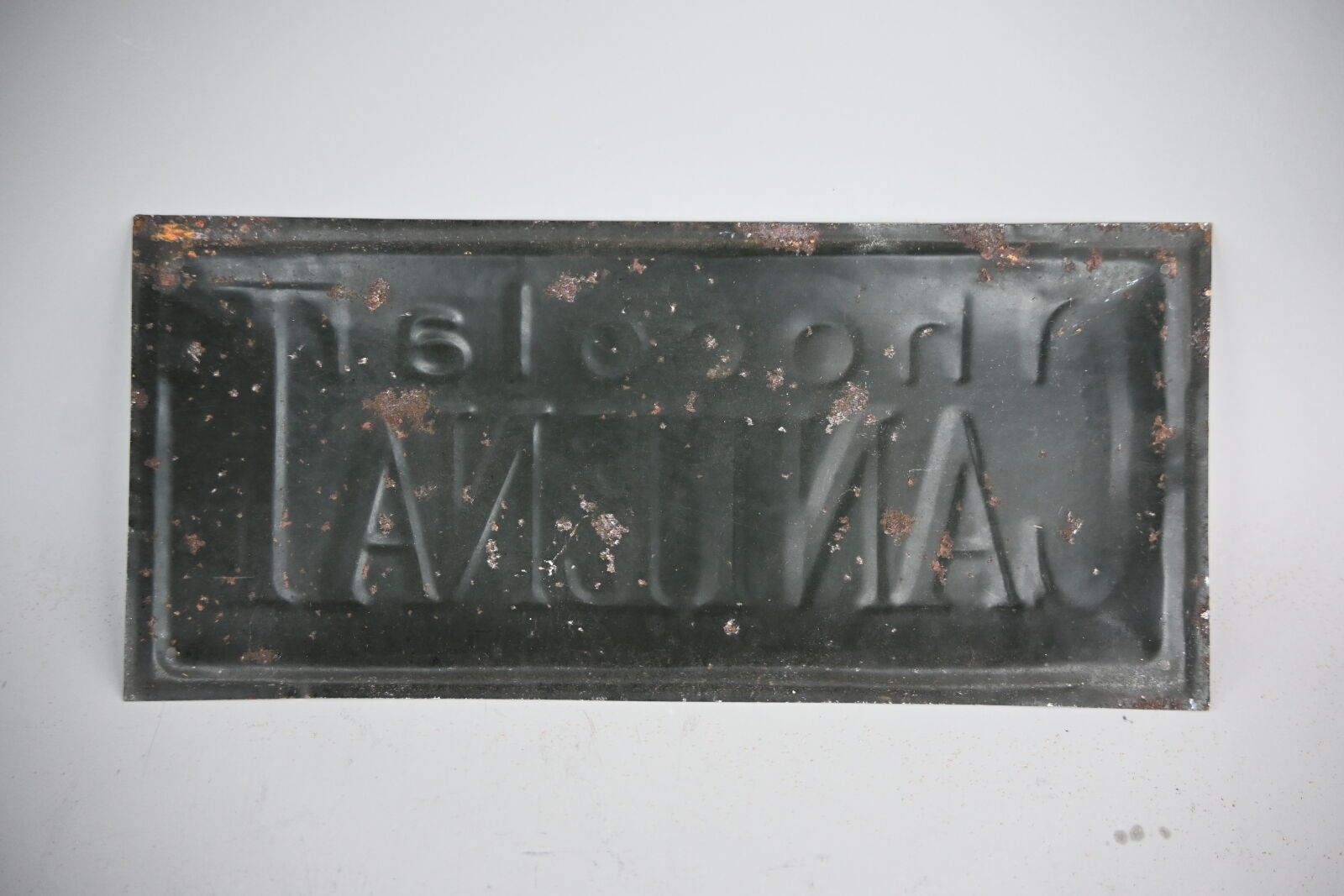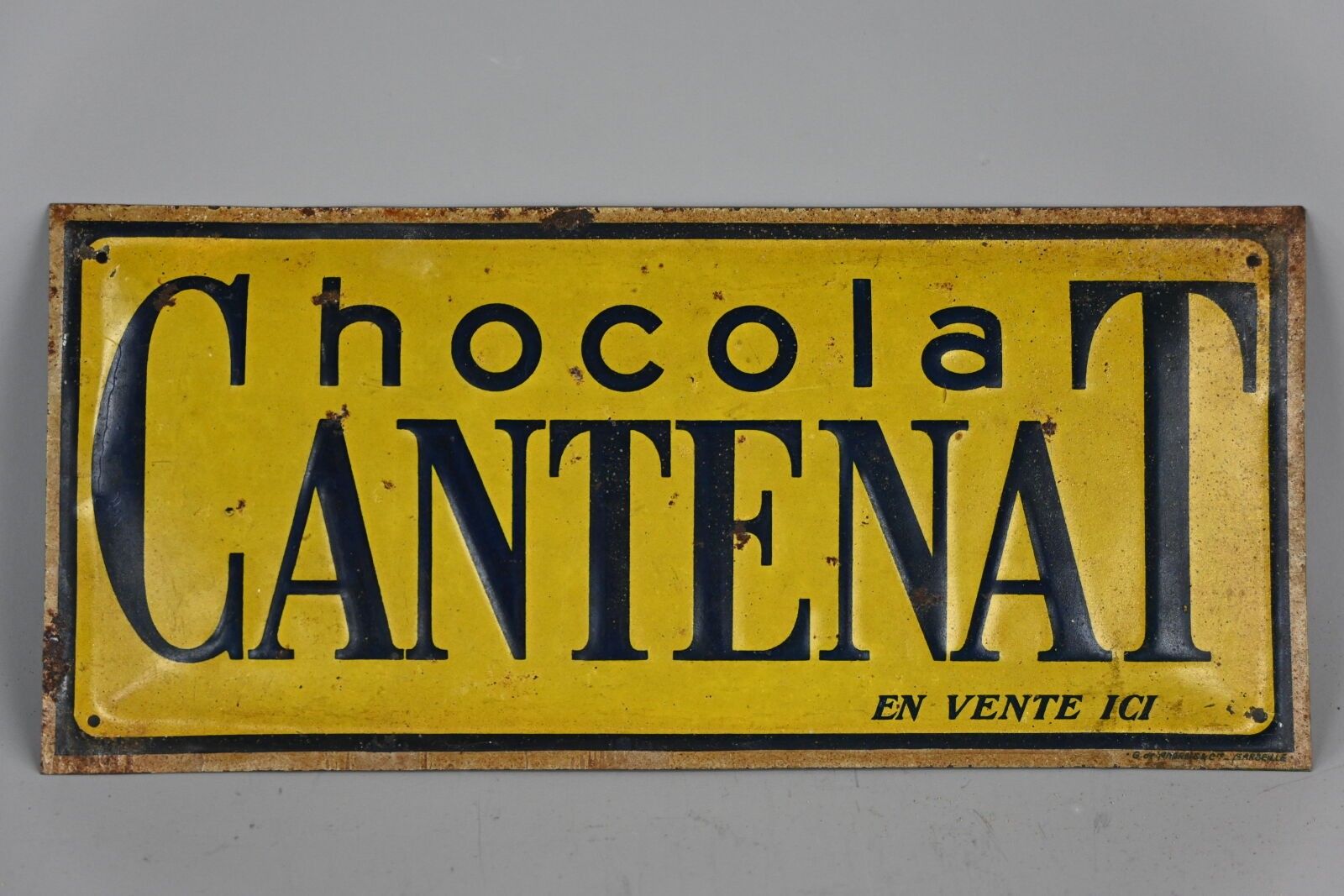 CHOCOLAT CANTENAT, Advertising plate in lithographed sheet metal, domed rectangular shape, with embossed lettering. G de Andreis & Cie Marseille. Oxidation, paint missing. Dimensions: 11 x 25 cm