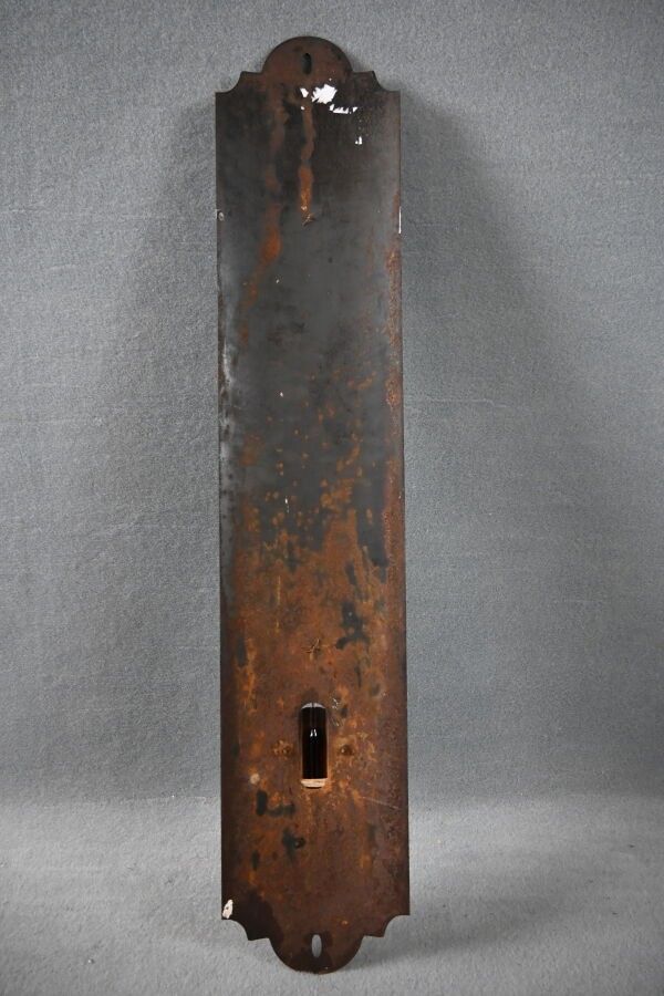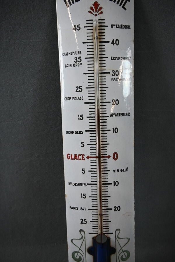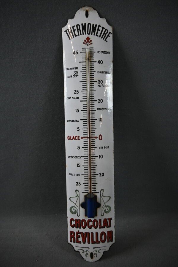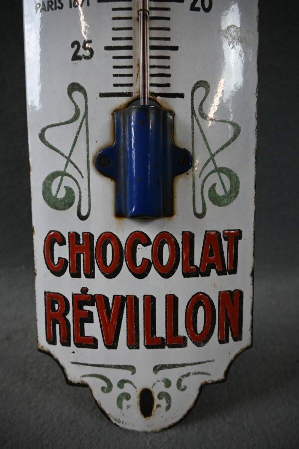 CHOCOLAT REVILLON, Advertising thermometer plate in enamelled sheet metal. Émaillerie Lyonnaise. Chips, slightly rubbed, tube attached. Dimensions: 95.5 x 19 cm