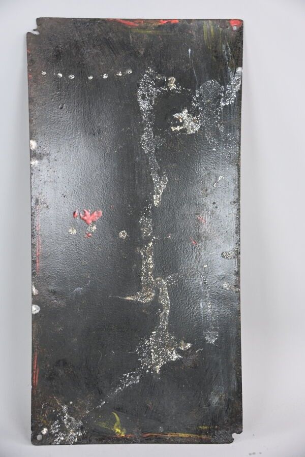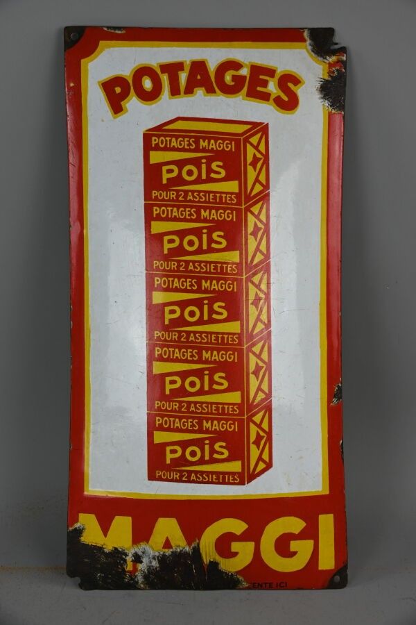 MAGGI, Soups. Advertising plate in enamelled sheet metal, rectangular shape, domed. Chips, missing. Dimensions: 39.5 x 19.5 cm