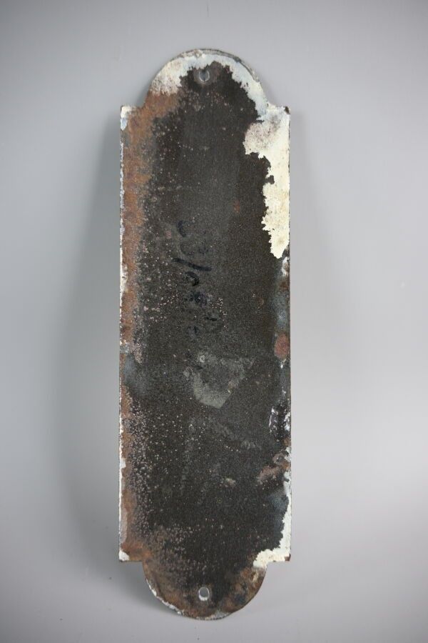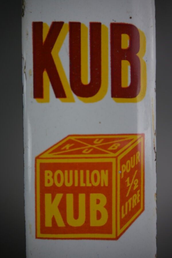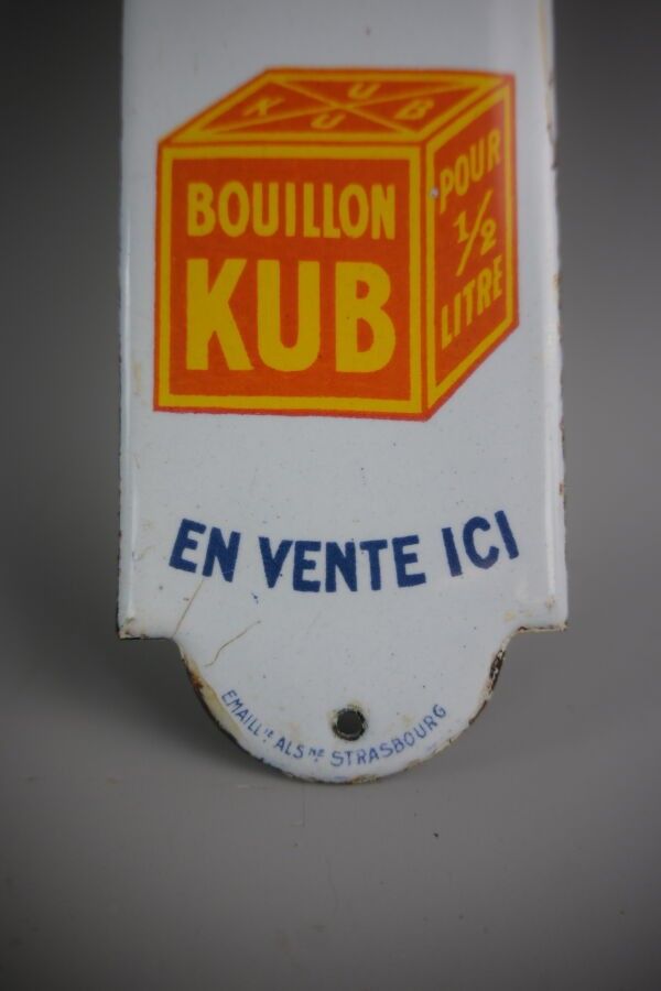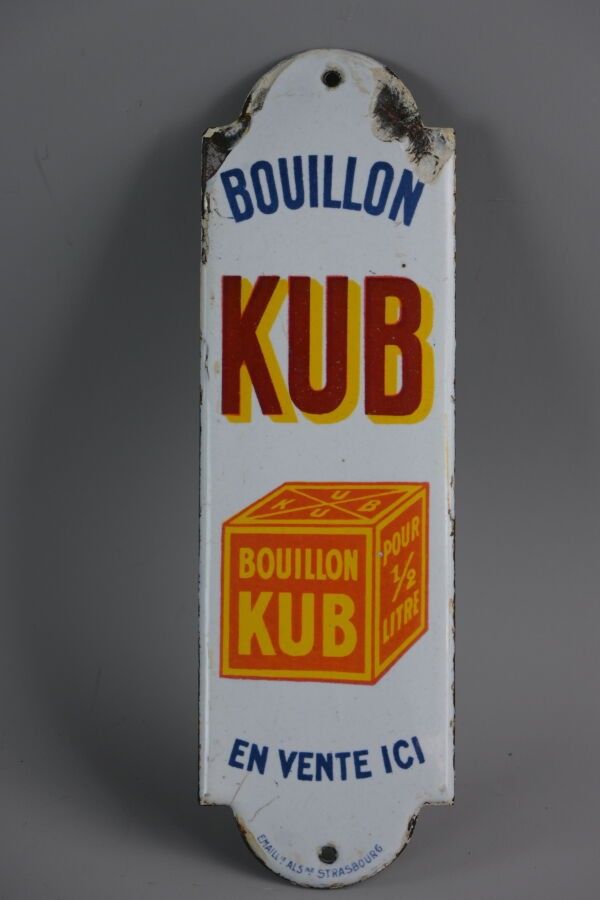 KUB, Enamelled sheet metal cover plate, cut-out. Émaillerie Alsacienne Strasbourg. Chips, distorted at the top. Dimensions: 20 x 6 cm