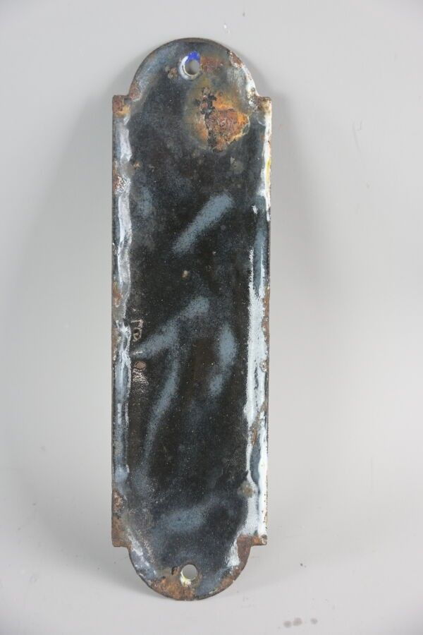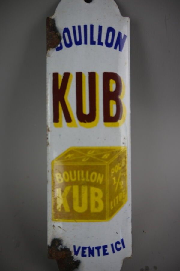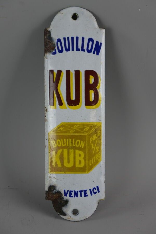 KUB, Enamelled sheet plate, cut-out. Enamel Ed. Jean Faded colours, chips. Dimensions: 20 x 5.5 cm