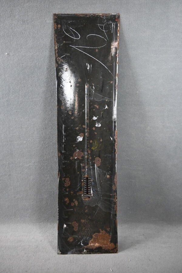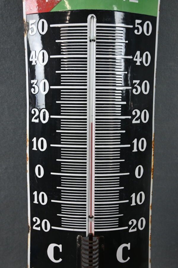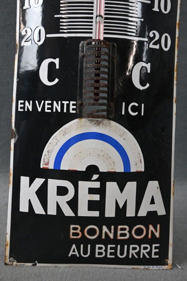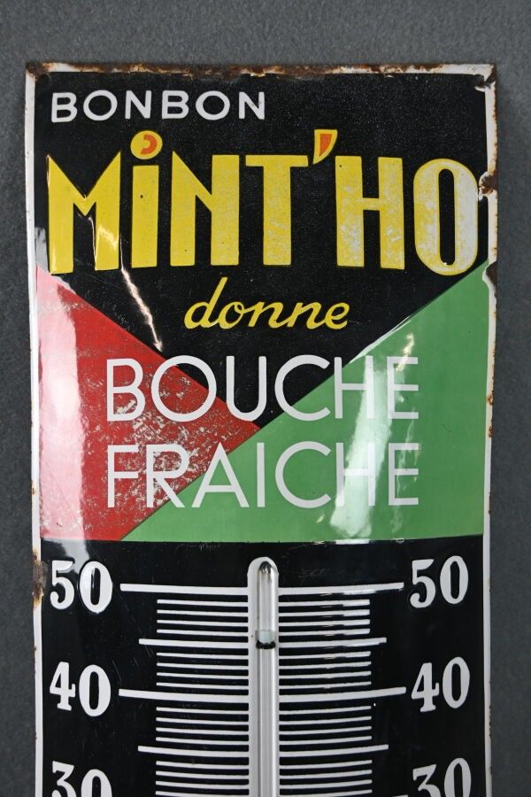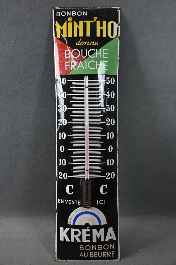 KREMA, Bonbons au beurre, "BOnbon Mint'Ho donne Bouche fraîche", Advertising thermometer plate in enamelled sheet metal with domed rectangular shape. Ferro-émail 10 av. G. Armée. Chips, oxidation, faded colour, paint stains. Dimensions: 115 x 30 cm