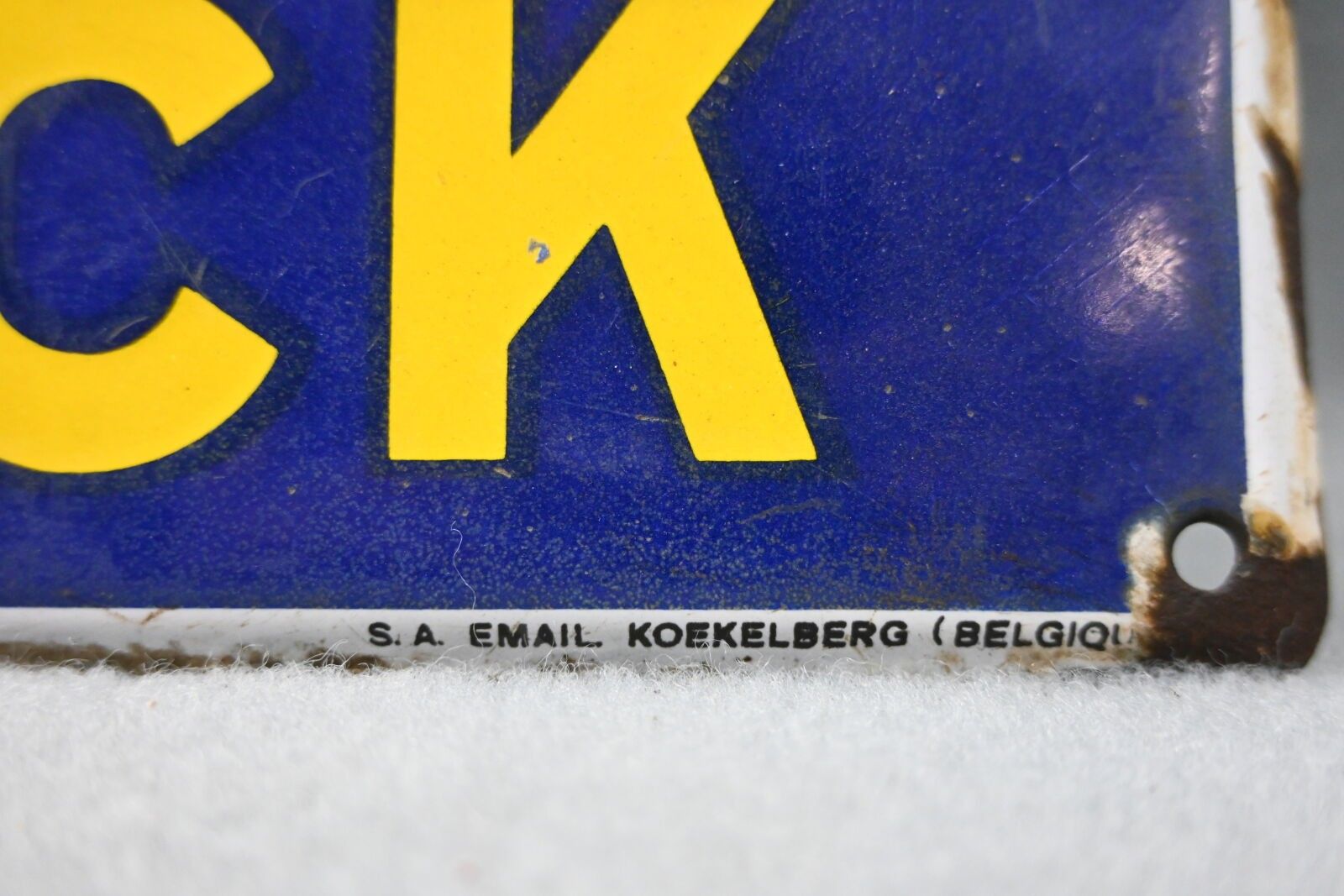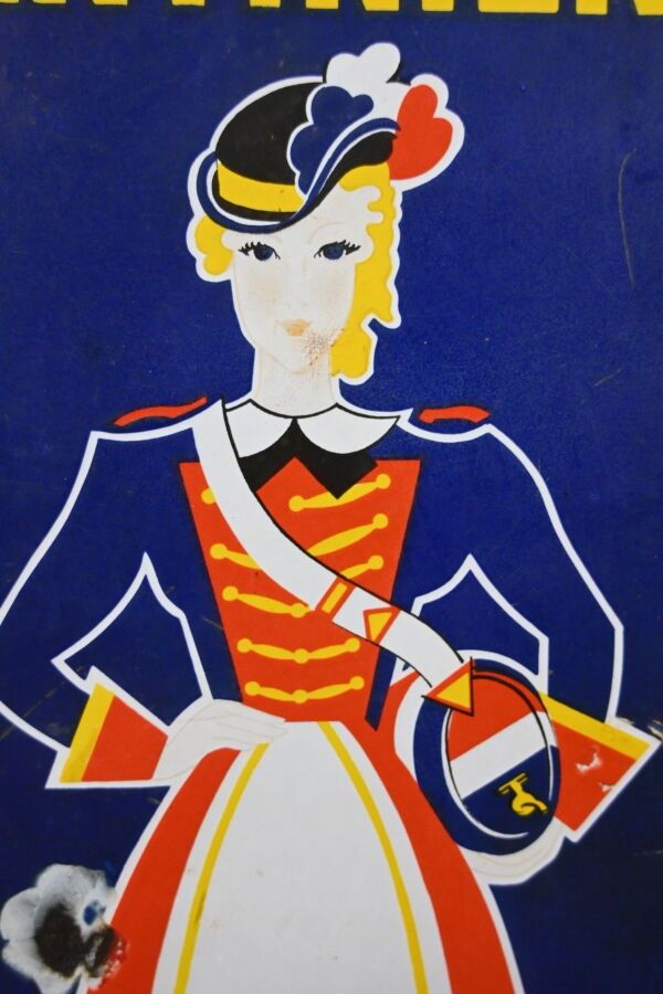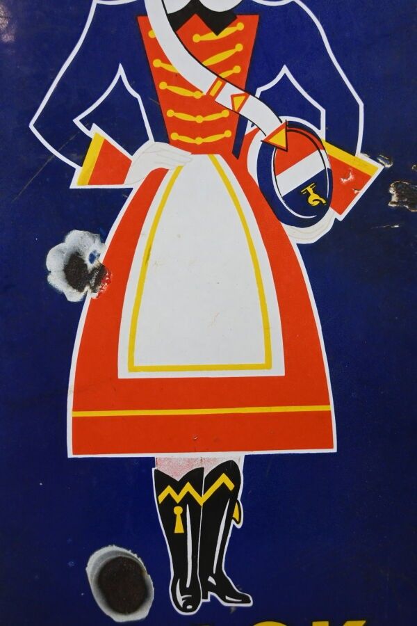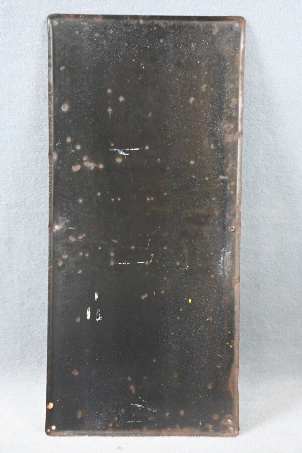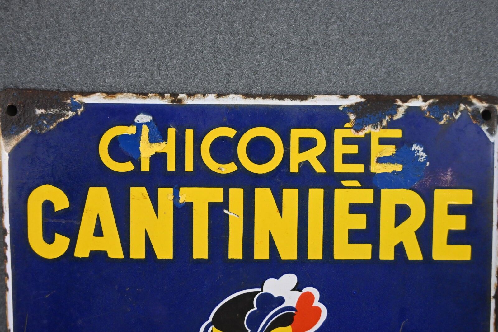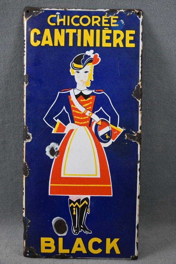 CHICOREE CANTINIERE BLACK, Advertising plate in enamelled sheet metal, rectangular chamfered shape, illustrated with the Cantinière. S.A. Email Koekelberg Belgium. Chips, scratches, repaints Dimensions: 74.5 x 34.5 cm