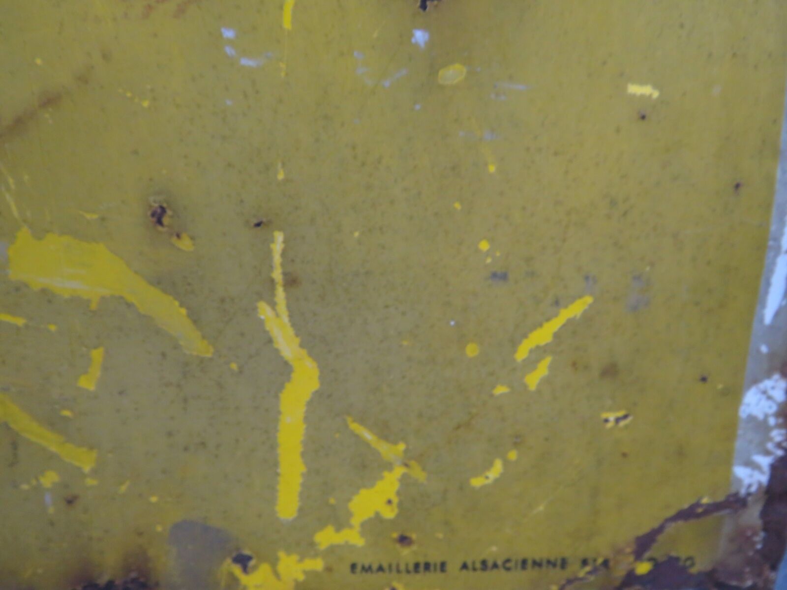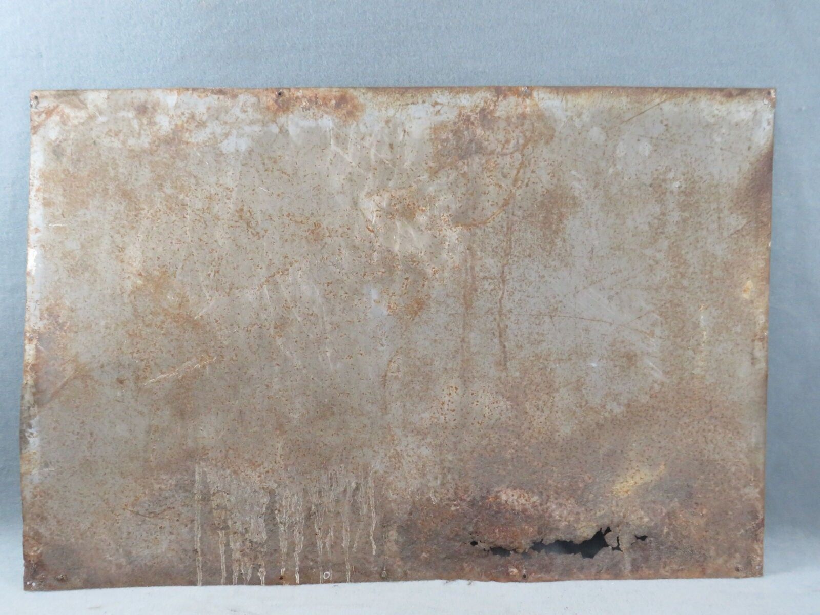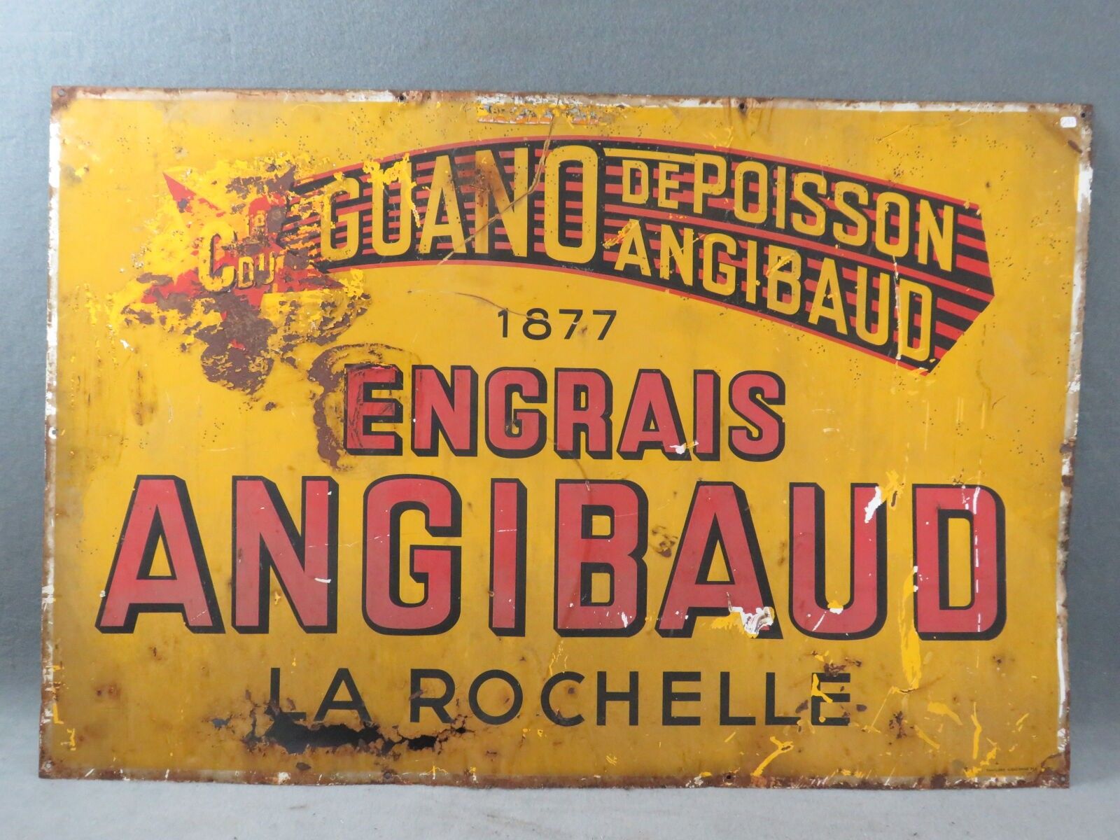 ENGRAIS ANGIBAUD, Advertising plate in lithographed sheet metal, rectangular shape. Émaillerie Alsacienne Strasbourg. Significant damage, perforations, deformation and oxidation. Dimensions: 80 x 120 cm.