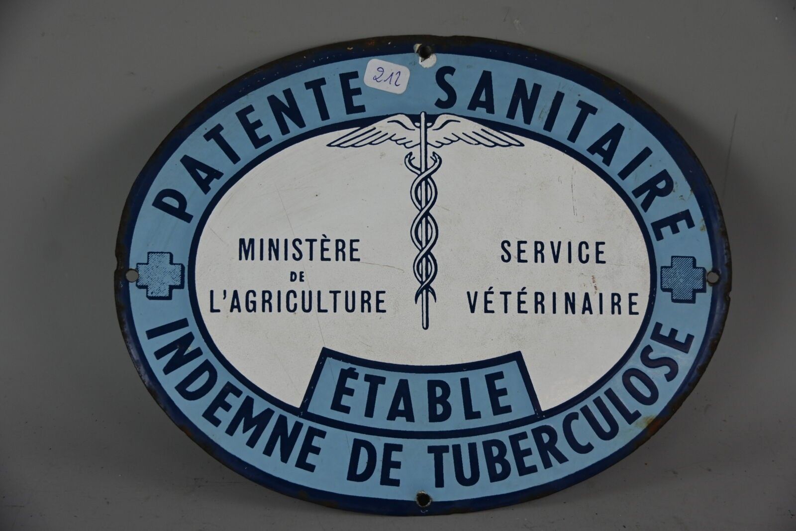 PATENTE SANITAIRE INDEMNE DE TUBERCULOSE, Ministère de l'Agriculture service vétérinaire. Oval enamelled sheet metal plate. Chips, missing. Dimensions: 20 x 25.5 cm.